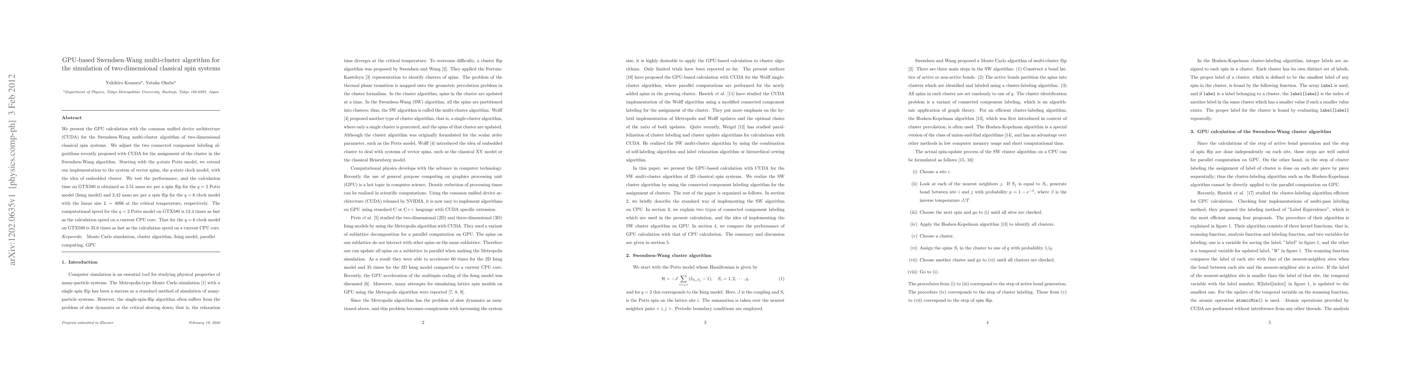 This paper presents a GPU-based implementation of the Swendsen-Wang multi-cluster algorithm using CUDA for simulating two-dimensional classical spin systems, achieving significant speedups over CPU calculations, with a speedup of 12.4 times for the Potts model and 35.6 times for the clock model on a GTX580 GPU.