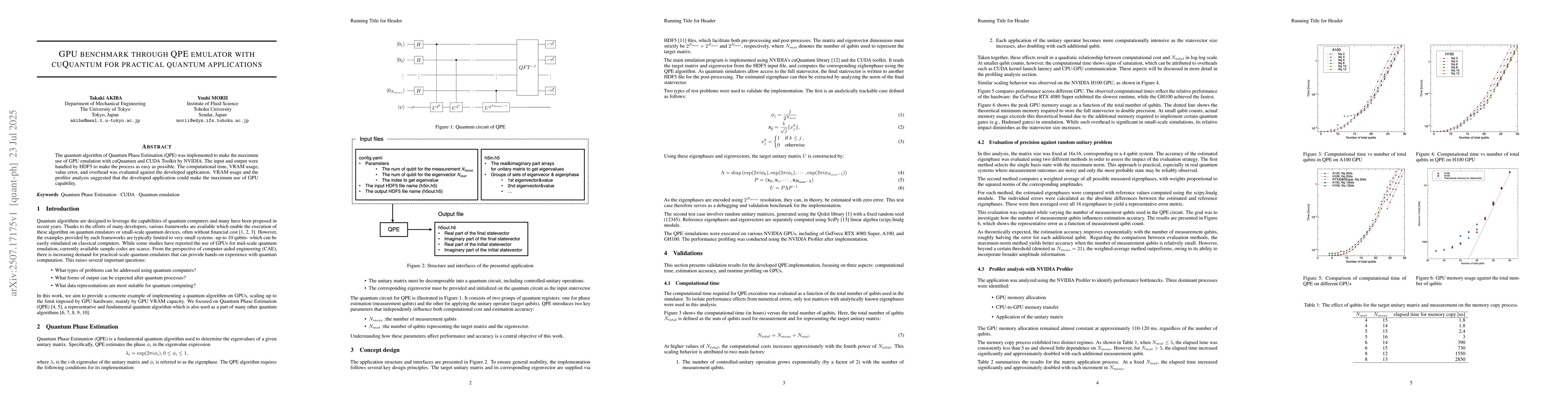 The quantum algorithm of Quantum Phase Estimation (QPE) was implemented to make the maximum use of GPU emulation with cuQuantum and CUDA Toolkit by NVIDIA. The input and output were handled by HDF5 to make the process as easy as possible. The computational time, VRAM usage, value error, and overhead was evaluated against the developed application. VRAM usage and the profiler analysis suggested that the developed application could make the maximum use of GPU capability.