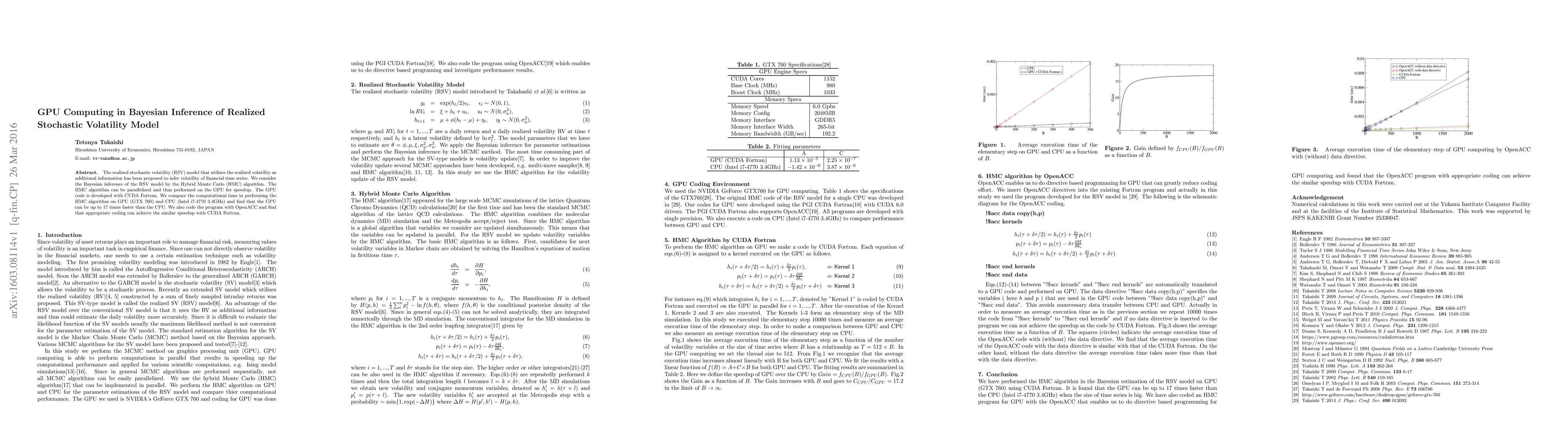 This paper explores using GPUs to speed up Bayesian inference of a financial model called realized stochastic volatility (RSV) model, achieving significant speedups of up to 17 times compared to CPU computations.
