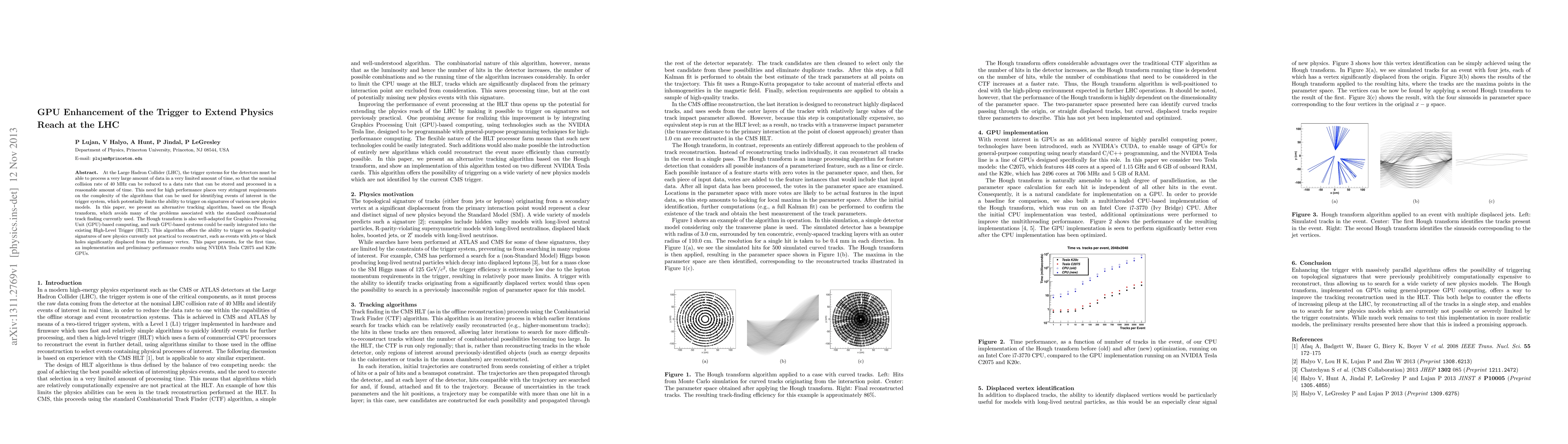 At the Large Hadron Collider (LHC), the trigger systems for the detectors must be able to process a very large amount of data in a very limited amount of time, so that the nominal collision rate of 40 MHz can be reduced to a data rate that can be stored and processed in a reasonable amount of time. This need for high performance places very stringent requirements on the complexity of the algorithms that can be used for identifying events of interest in the trigger system, which potentially limits the ability to trigger on signatures of various new physics models. In this paper, we present an alternative tracking algorithm, based on the Hough transform, which avoids many of the problems associated with the standard combinatorial track finding currently used. The Hough transform is also well-adapted for Graphics Processing Unit (GPU)-based computing, and such GPU-based systems could be easily integrated into the existing High-Level Trigger (HLT). This algorithm offers the ability to trigger on topological signatures of new physics currently not practical to reconstruct, such as events with jets or black holes significantly displaced from the primary vertex. This paper presents, for the first time, an implementation and preliminary performance results using NVIDIA Tesla C2075 and K20c GPUs.