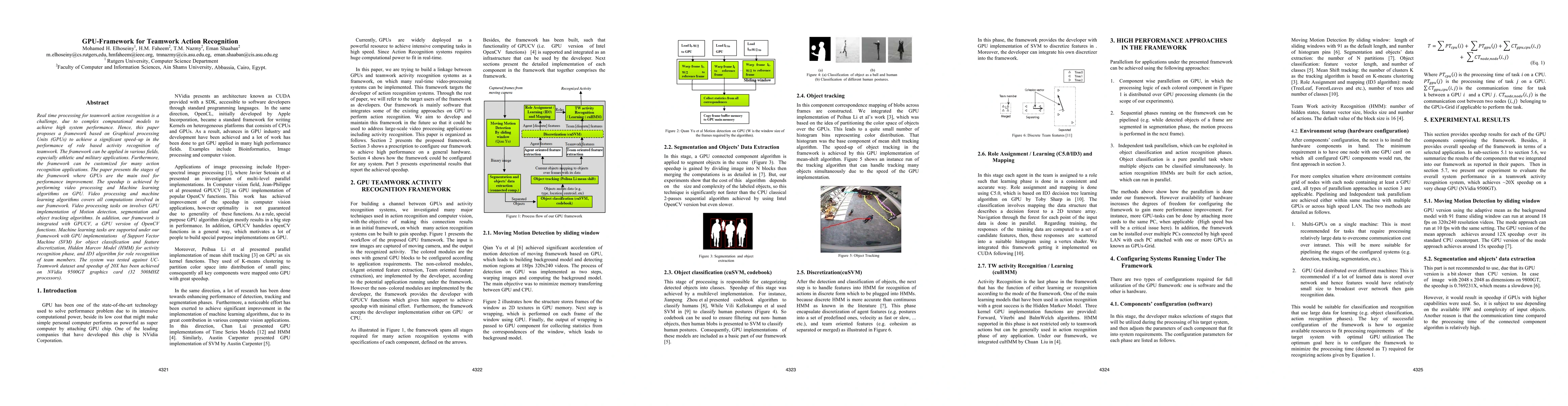 Real time processing for teamwork action recognition is a challenge, due to complex computational models to achieve high system performance. Hence, this paper proposes a framework based on Graphical Processing Units (GPUs) to achieve a significant speed up in the performance of role based activity recognition of teamwork. The framework can be applied in various fields, especially athletic and military applications. Furthermore, the framework can be customized for many action recognition applications. The paper presents the stages of the framework where GPUs are the main tool for performance improvement. The speedup is achieved by performing video processing and Machine learning algorithms on GPU. Video processing and machine learning algorithms covers all computations involved in our framework. Video processing tasks on involves GPU implementation of Motion detection, segmentation and object tracking algorithms. In addition, our framework is integrated with GPUCV, a GPU version of OpenCV functions. Machine learning tasks are supported under our framework with GPU implementations of Support Vector Machine (SVM) for object classification and feature discretization, Hidden Marcov Model (HMM) for activity recognition phase, and ID3 algorithm for role recognition of team members. The system was tested against UC-Teamwork dataset and speedup of 20X has been achieved on NVidia 9500GT graphics card (32 500MHZ processors).