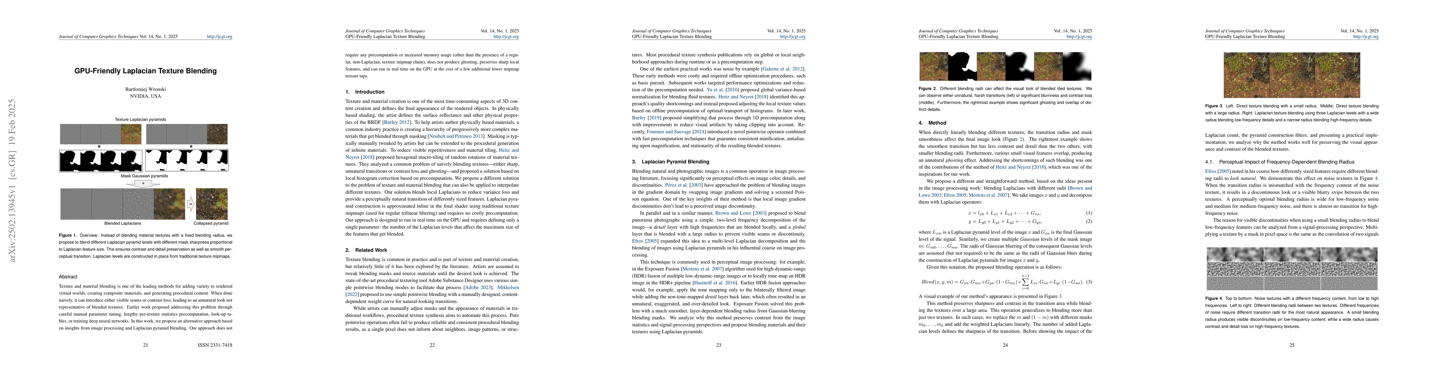 Title: GPU-Friendly Laplacian Texture Blending Summary: This paper proposes a GPU-friendly method for blending textures based on Laplacian pyramid blending to avoid seams and contrast loss without precomputation or increased memory usage, ensuring real-time performance and preservation of sharp features.