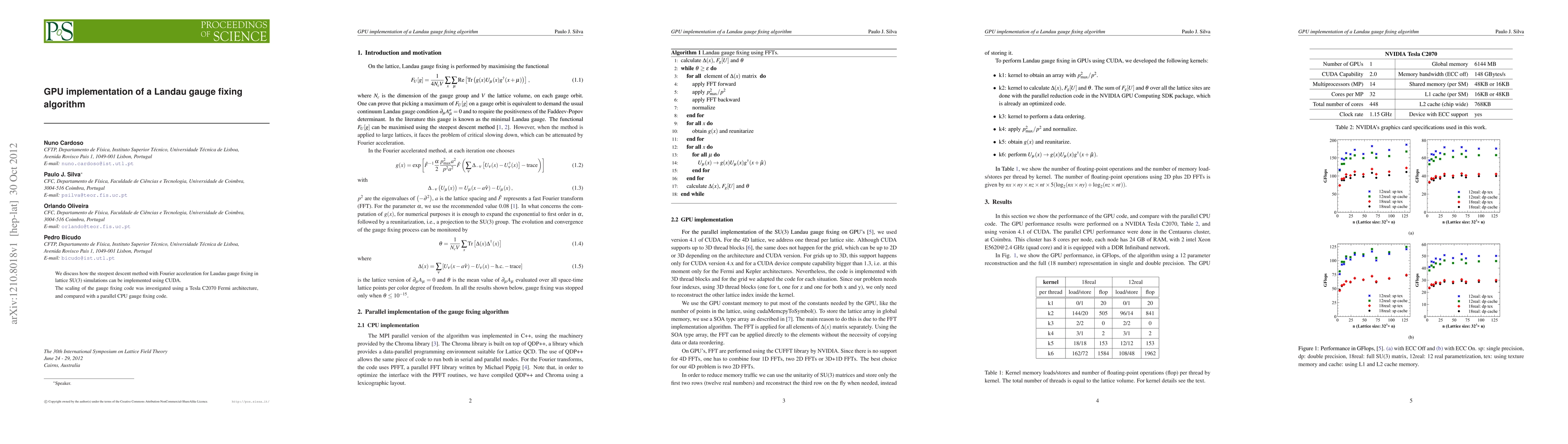 We discuss how the steepest descent method with Fourier acceleration for Laudau gauge fixing in lattice SU(3) simulations can be implemented using CUDA. The scaling of the gauge fixing code was investigated using a Tesla C2070 Fermi architecture, and compared with a parallel CPU gauge fixing code.