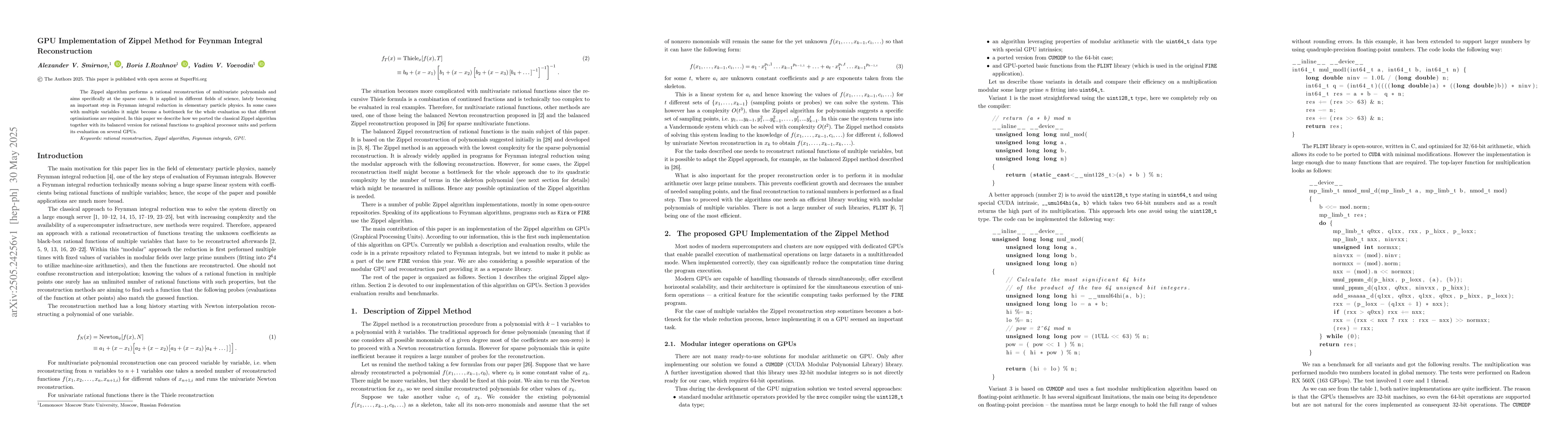 The paper describes the porting and adaptation of FLINT functions to implement the Zippel method on GPUs for Feynman integral reconstruction, utilizing aligned memory, accumulated sums, and efficient inter-thread communication.