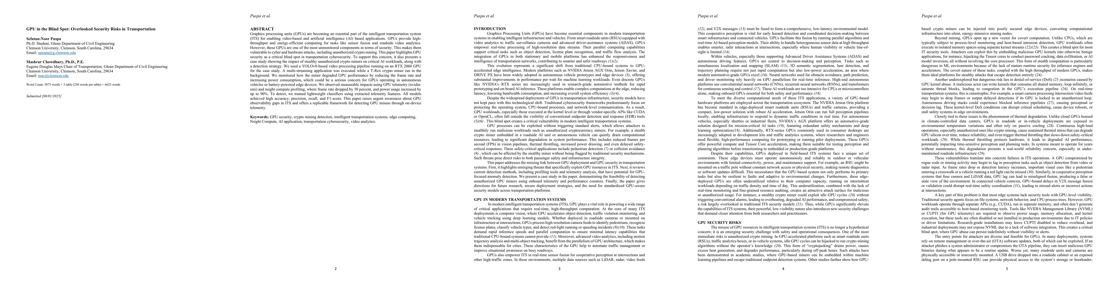 Graphics processing units (GPUs) are becoming an essential part of the intelligent transportation system (ITS) for enabling video-based and artificial intelligence (AI) based applications. GPUs provide high-throughput and energy-efficient computing for tasks like sensor fusion and roadside video analytics. However, these GPUs are one of the most unmonitored components in terms of security. This makes them vulnerable to cyber and hardware attacks, including unauthorized crypto mining. This paper highlights GPU security as a critical blind spot in transportation cybersecurity. To support this concern, it also presents a case study showing the impact of stealthy unauthorized crypto miners on critical AI workloads, along with a detection strategy. We used a YOLOv8-based video processing pipeline running on an RTX 2060 GPU for the case study. A multi-streaming application was executed while a T-Rex crypto miner ran in the background. We monitored how the miner degraded GPU performance by reducing the frame rate and increasing power consumption, which could be a serious concern for GPUs operating in autonomous vehicles or battery-powered edge devices. We observed measurable impacts using GPU telemetry (nvidia-smi) and Nsight Compute profiling, where frame rate dropped by 50 percent, and power usage increased by up to 90%. To detect, we trained lightweight classifiers using extracted telemetry features. All models achieved high accuracy, precision, recall, and F1-score. This paper raises urgent awareness about GPU observability gaps in ITS and offers a replicable framework for detecting GPU misuse through on-device telemetry.