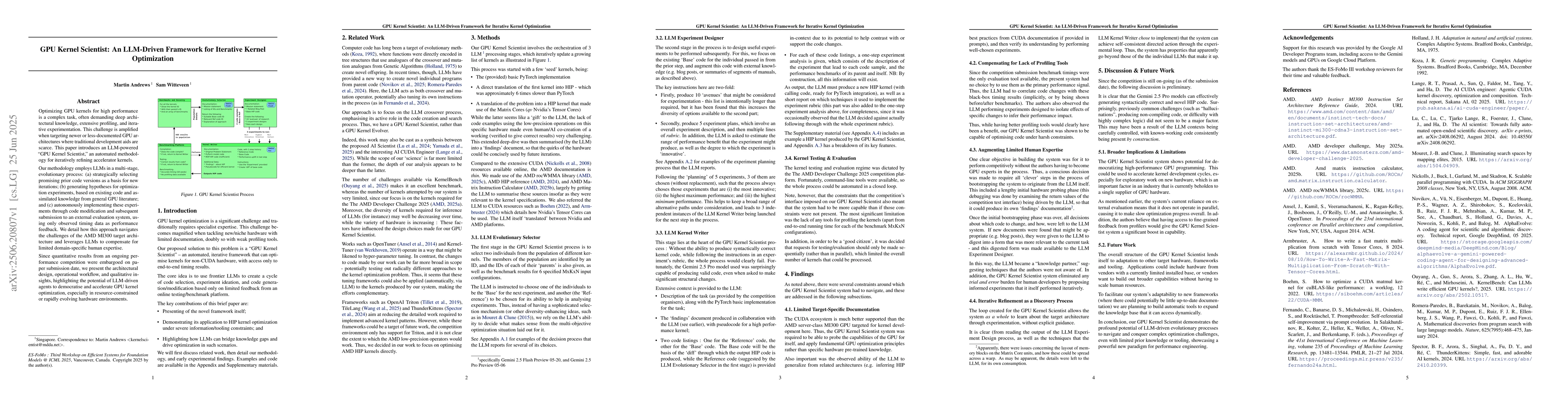 Optimizing GPU kernels for high performance is a complex task, often demanding deep architectural knowledge, extensive profiling, and iterative experimentation. This challenge is amplified when targeting newer or less-documented GPU architectures where traditional development aids are scarce. This paper introduces an LLM-powered "GPU Kernel Scientist," an automated methodology for iteratively refining accelerator kernels. Our methodology employs LLMs in a multi-stage, evolutionary process: (a) strategically selecting promising prior code versions as a basis for new iterations; (b) generating hypotheses for optimization experiments, based on existing code and assimilated knowledge from general GPU literature; and (c) autonomously implementing these experiments through code modification and subsequent submission to an external evaluation system, using only observed timing data as performance feedback. We detail how this approach navigates the challenges of the AMD MI300 target architecture and leverages LLMs to compensate for limited domain-specific human expertise. Since quantitative results from an ongoing performance competition were embargoed on paper submission date, we present the architectural design, operational workflow, and qualitative insights, highlighting the potential of LLM-driven agents to democratise and accelerate GPU kernel optimization, especially in resource-constrained or rapidly evolving hardware environments.