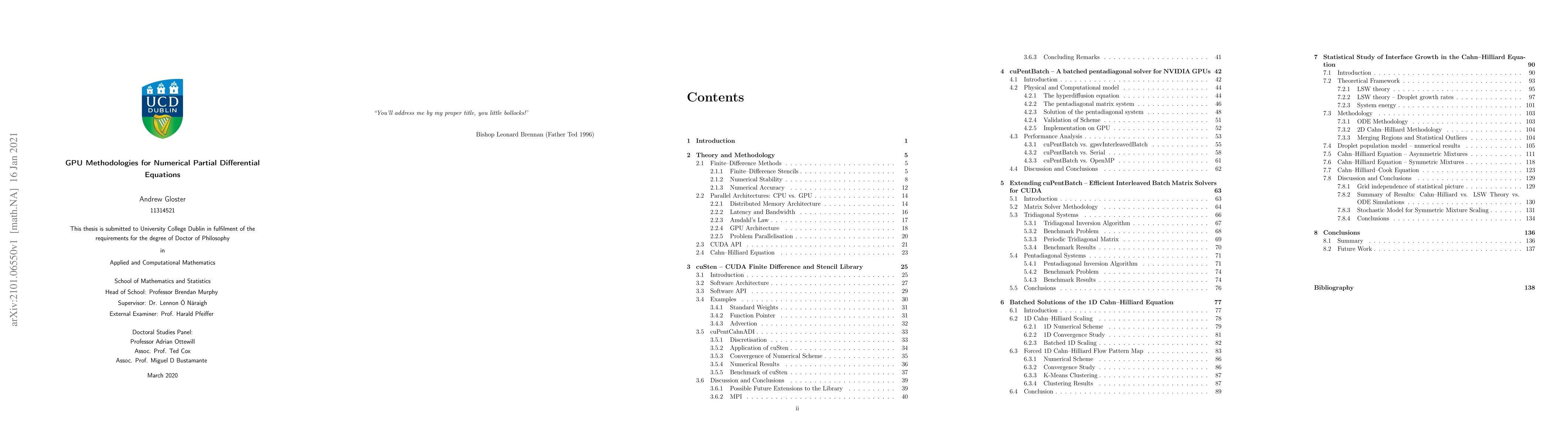 In this thesis we develop techniques to efficiently solve numerical Partial Differential Equations (PDEs) using Graphical Processing Units (GPUs). Focus is put on both performance and re--usability of the methods developed, to this end a library, cuSten, for applying finite--difference stencils to numerical grids is presented herein. On top of this various batched tridiagonal and pentadiagonal matrix solvers are discussed. These have been benchmarked against the current state of the art and shown to improve performance in the solution of numerical PDEs. A variety of other benchmarks and use cases for the GPU methodologies are presented using the Cahn--Hilliard equation as a core example, but it is emphasised the methods are completely general. Finally through the application of the GPU methodologies to the Cahn--Hilliard equation new results are presented on the growth rates of the coarsened domains. In particular a statistical model is built up using batches of simulations run on GPUs from which the growth rates are extracted, it is shown that in a finite domain that the traditionally presented results of 1/3 scaling is in fact a distribution around this value. This result is discussed in conjunction with modelling via a stochastic PDE and sheds new light on the behaviour of the Cahn--Hilliard equation in finite domains.