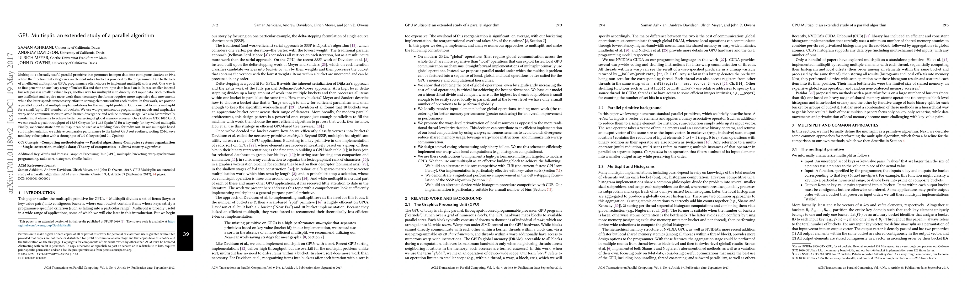 Multisplit is a broadly useful parallel primitive that permutes its input data into contiguous buckets or bins, where the function that categorizes an element into a bucket is provided by the programmer. Due to the lack of an efficient multisplit on GPUs, programmers often choose to implement multisplit with a sort. One way is to first generate an auxiliary array of bucket IDs and then sort input data based on it. In case smaller indexed buckets possess smaller valued keys, another way for multisplit is to directly sort input data. Both methods are inefficient and require more work than necessary: the former requires more expensive data movements while the latter spends unnecessary effort in sorting elements within each bucket. In this work, we provide a parallel model and multiple implementations for the multisplit problem. Our principal focus is multisplit for a small (up to 256) number of buckets. We use warp-synchronous programming models and emphasize warp-wide communications to avoid branch divergence and reduce memory usage. We also hierarchically reorder input elements to achieve better coalescing of global memory accesses. On a GeForce GTX 1080 GPU, we can reach a peak throughput of 18.93 Gkeys/s (or 11.68 Gpairs/s) for a key-only (or key-value) multisplit. Finally, we demonstrate how multisplit can be used as a building block for radix sort. In our multisplit-based sort implementation, we achieve comparable performance to the fastest GPU sort routines, sorting 32-bit keys (and key-value pairs) with a throughput of 3.0 G keys/s (and 2.1 Gpair/s).