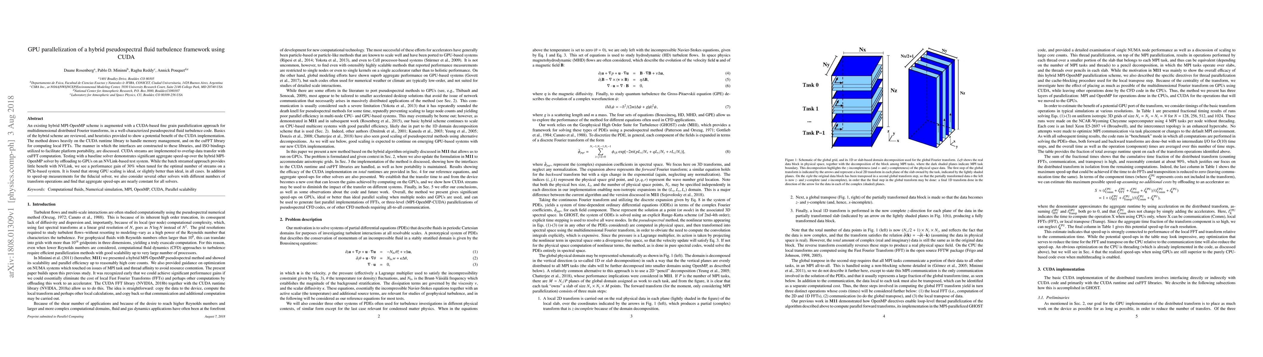 This paper presents a GPU parallelization of a hybrid pseudospectral fluid turbulence framework using CUDA, achieving significant speed-ups by leveraging CUDA runtime and cuFFT libraries. The study demonstrates a 30% performance gain on PCIe-based systems and nearly constant speed-ups across various solvers with different transform operations.