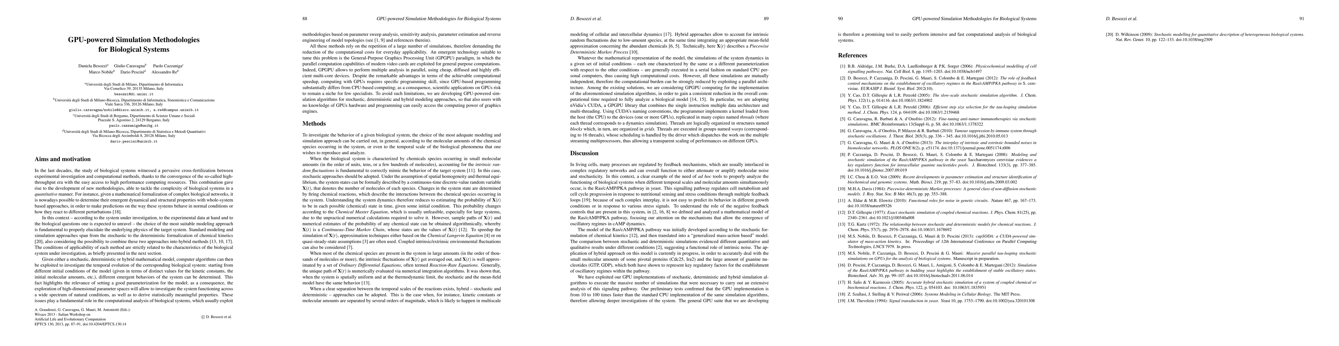 The study of biological systems witnessed a pervasive cross-fertilization between experimental investigation and computational methods. This gave rise to the development of new methodologies, able to tackle the complexity of biological systems in a quantitative manner. Computer algorithms allow to faithfully reproduce the dynamics of the corresponding biological system, and, at the price of a large number of simulations, it is possible to extensively investigate the system functioning across a wide spectrum of natural conditions. To enable multiple analysis in parallel, using cheap, diffused and highly efficient multi-core devices we developed GPU-powered simulation algorithms for stochastic, deterministic and hybrid modeling approaches, so that also users with no knowledge of GPUs hardware and programming can easily access the computing power of graphics engines.
