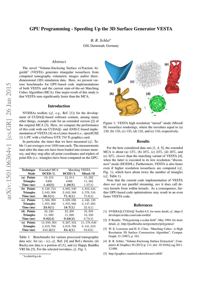 The novel "Volume-Enclosing Surface exTraction Algorithm" (VESTA) generates triangular isosurfaces from computed tomography volumetric images and/or three-dimensional (3D) simulation data. Here, we present various benchmarks for GPU-based code implementations of both VESTA and the current state-of-the-art Marching Cubes Algorithm (MCA). One major result of this study is that VESTA runs significantly faster than the MCA.