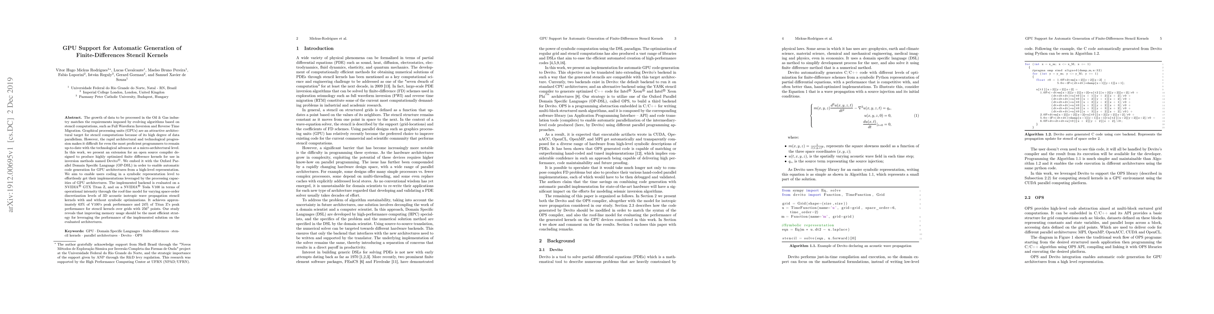 This paper presents an extension for the Devito compiler to automatically generate optimized finite-difference stencil kernels for GPU architectures, leveraging the Oxford Parallel Domain Specific Language (OP-DSL). The implementation achieves significant performance on evaluated GPUs, though memory optimization remains a key area for further improvement.