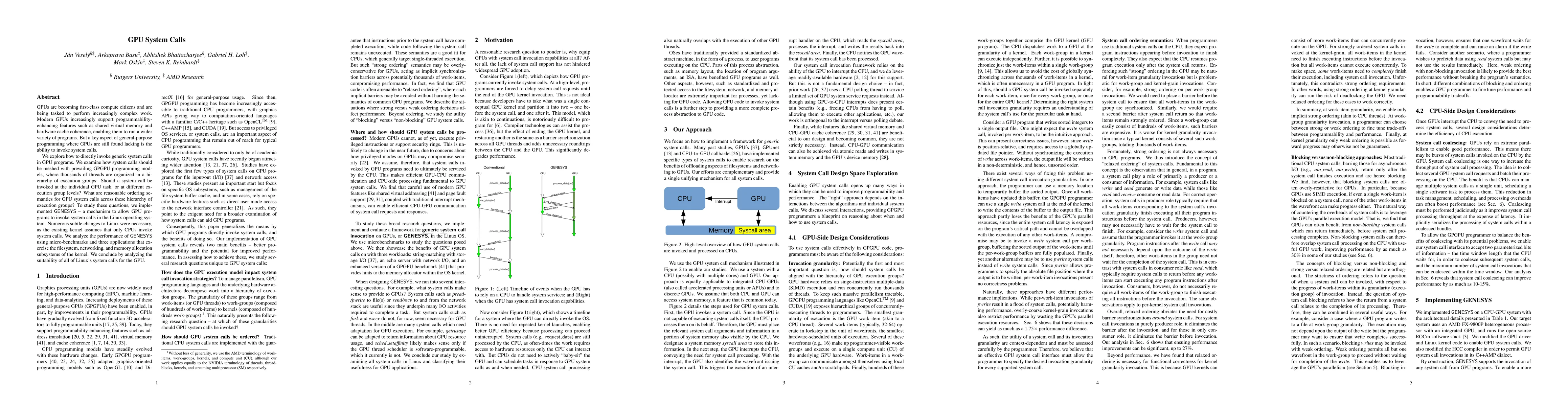 This paper explores the integration of system calls into GPU programming, proposing GENESYS to enable GPU programs to invoke Linux system calls directly. It investigates the appropriate invocation levels and ordering semantics for GPU system calls, and evaluates its performance through micro-benchmarks and applications involving filesystem, networking, and memory allocation.