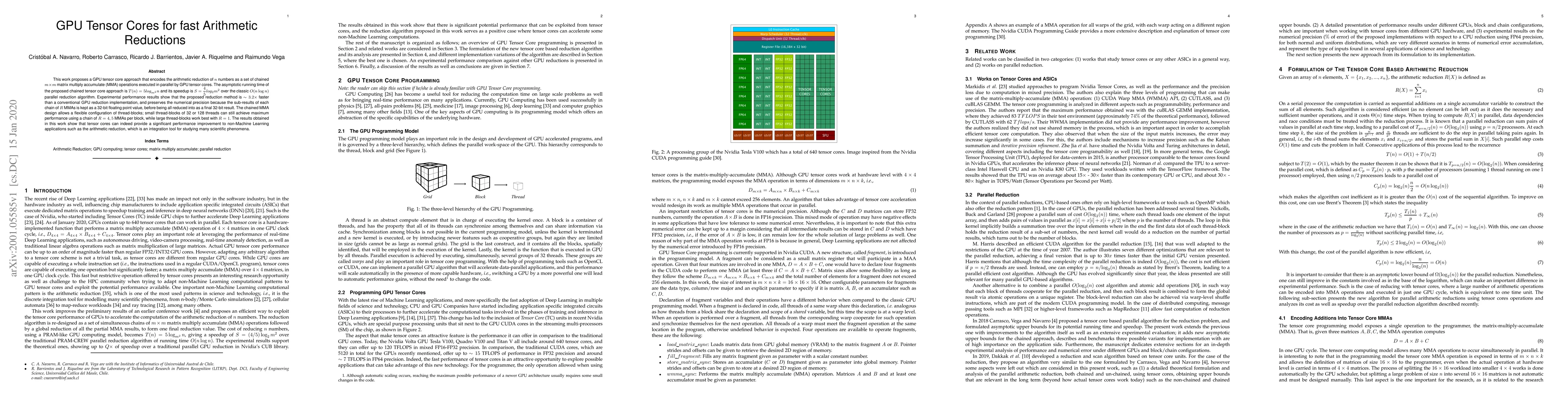 This paper proposes a GPU tensor core method for fast arithmetic reductions, encoding reductions as chained matrix multiply accumulate operations. It achieves a running time of $T(n)=5 \log_{m^2}{n}$ and a speedup of $S=\dfrac{4}{5} \log_{2}{m^2}$ over traditional parallel reduction, demonstrating up to 3.2x faster performance while maintaining numerical precision.