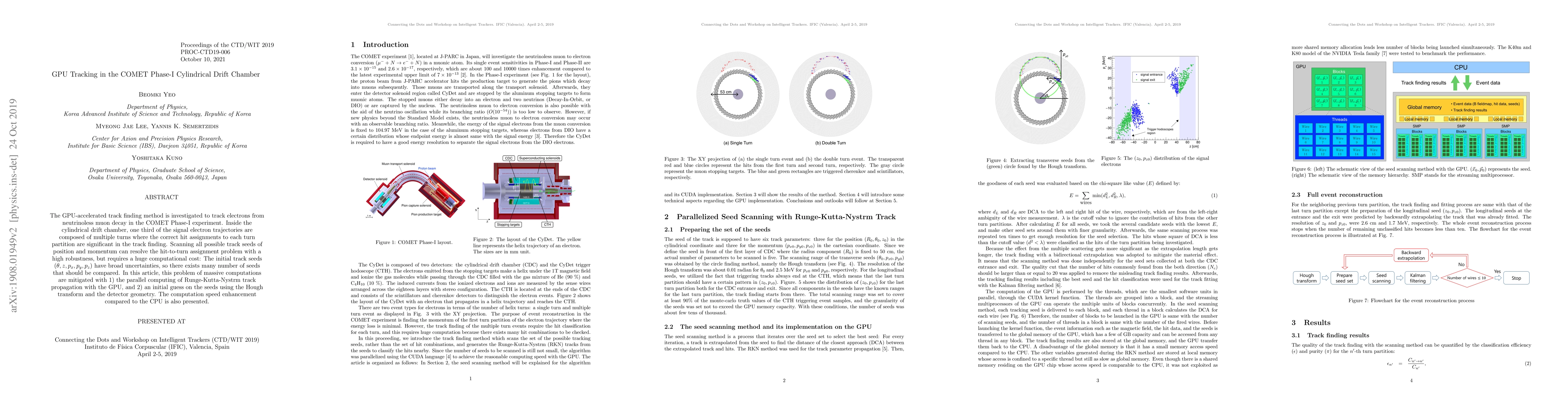 The GPU-accelerated track finding method is investigated to track electrons from neutrinoless muon decay in the COMET Phase-I experiment. Inside the cylindrical drift chamber, one third of the signal electron trajectories are composed of multiple turns where the correct hit assignments to each turn partition are significant in the track finding. Scanning all possible track seeds of position and momentum can resolve the hit-to-turn assignment problem with a high robustness, but requires a huge computational cost: The initial track seeds $(\theta,z,p_x,p_y,p_z)$ have broad uncertainties, so there exists many number of seeds that should be compared. In this article, this problem of massive computations are mitigated with 1) the parallel computing of Runge-Kutta-Nystr\"om track propagation with the GPU, and 2) an initial guess on the seeds using the Hough transform and the detector geometry. The computation speed enhancement compared to the CPU is also presented.