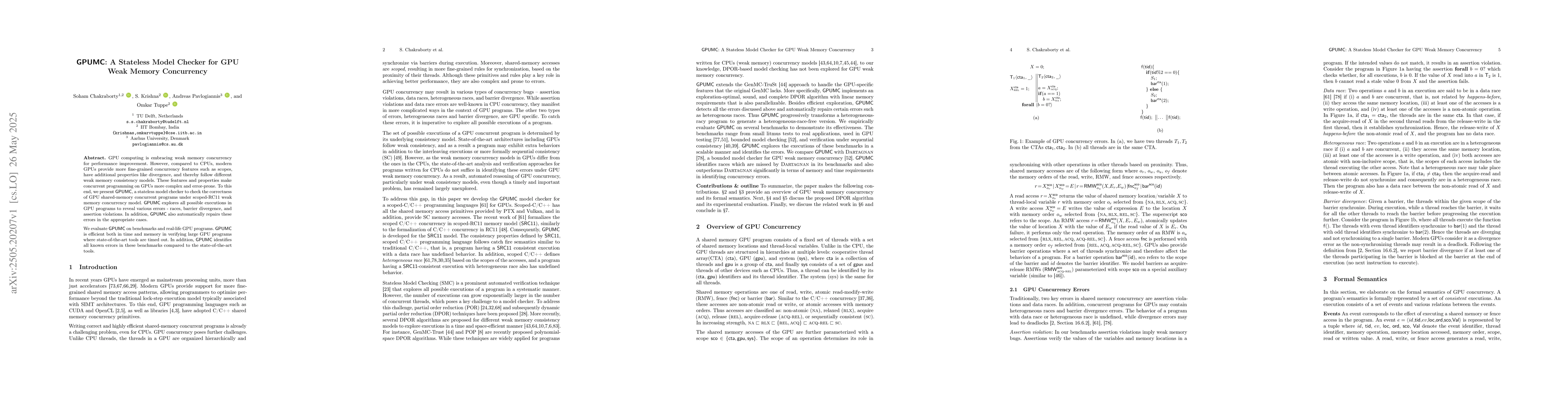 The research introduces GPUMC, a stateless model checker designed to verify GPU shared-memory concurrent programs under the scoped-RC11 weak memory concurrency model, exploring all possible executions to detect races, barrier divergence, and assertion violations, while also offering automatic repair in appropriate cases.
