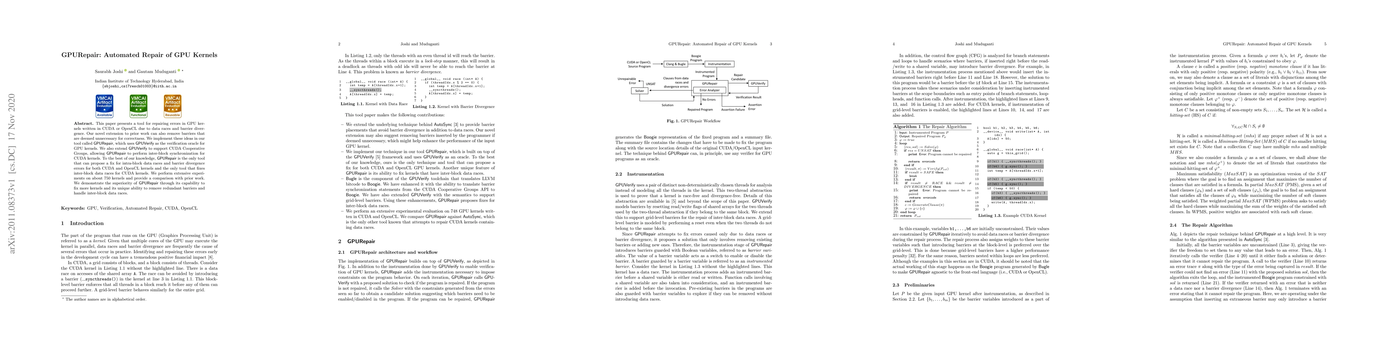 GPURepair is an automated tool for repairing errors in GPU kernels written in CUDA or OpenCL, addressing data races and barrier divergence. It extends GPUVerify to support CUDA Cooperative Groups and can remove unnecessary barriers, outperforming prior tools in fixing more kernels and handling inter-block data races.