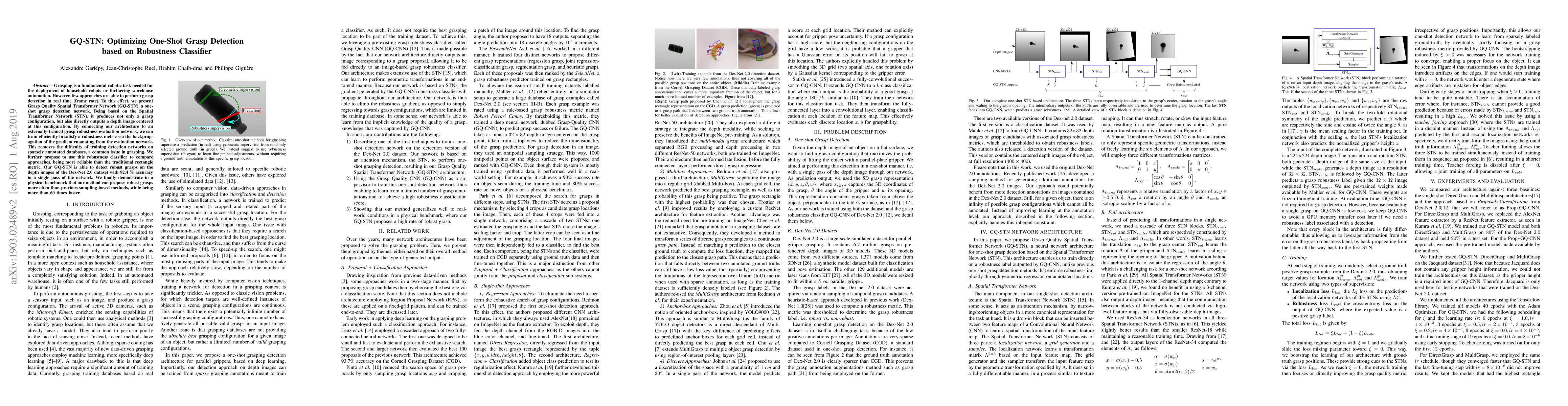 The GQ-STN network optimizes one-shot grasp detection using a Spatial Transformer Network that outputs grasp configurations and depth images, trained via a robustness classifier to improve efficiency and accuracy. It achieves 92.4% accuracy on the Dex-Net 2.0 dataset and is significantly faster than previous methods.