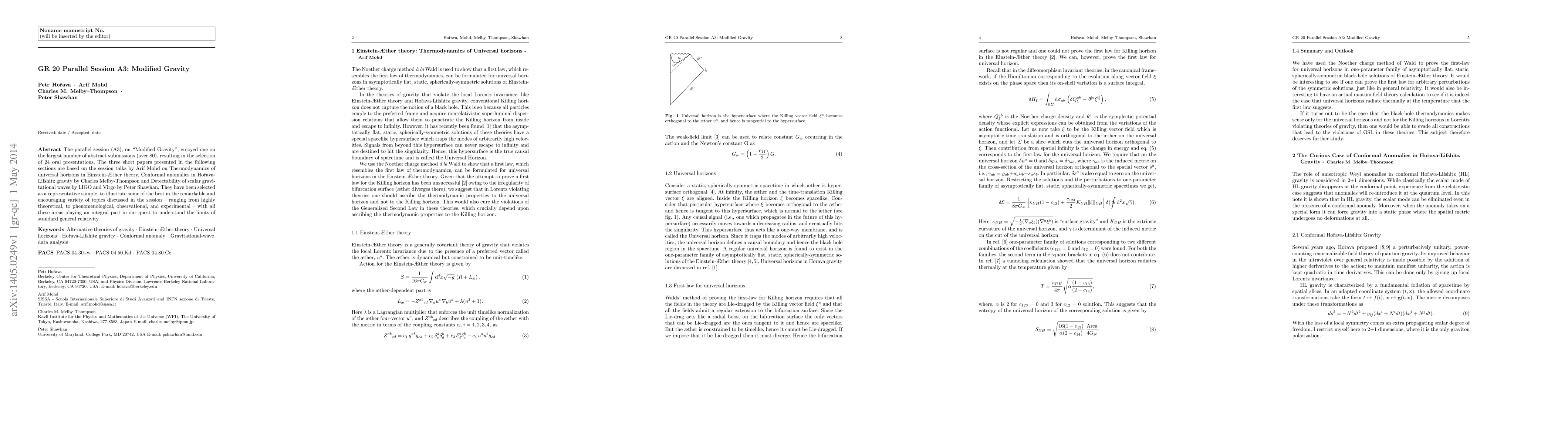 This is the contribution representing Parallel Session A3, on Modified Gravity, in the Proceedings of the GR 20 Conference (July 2013, Warszawa, Poland). It consists of three invited chapters, selected by the Session Chair (P.H.) to represent the broad spectrum of topics discussed in the Session, which ranged from theoretical and phenomenological, to experimental, observational and numerical aspects of gravity. The three chapters are "Einstein-Aether Theory: Thermodynamics of Universal Horizons" by Arif Mohd, "The Curious Case of Conformal Anomalies in Horava-Lifshitz Gravity" by Charles M. Melby-Thompson, and "Detectability of Scalar Gravitational-Wave Bursts with LIGO and Virgo" by Peter Shawhan.