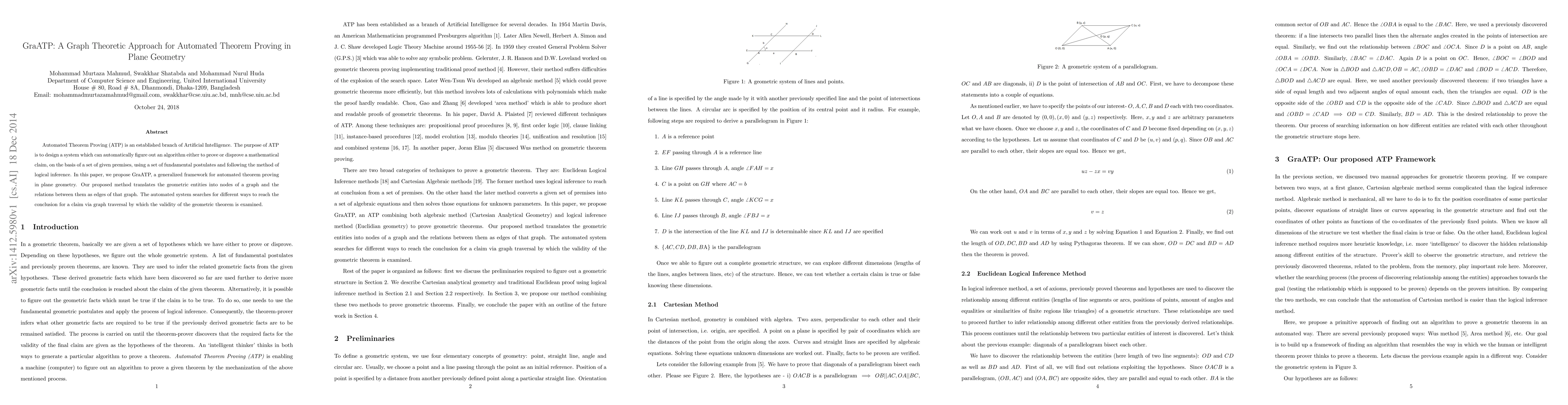 GraATP presents a novel graph-theoretic approach for automated theorem proving in plane geometry, transforming geometric entities into graph nodes and relations to edges, thereby enabling the system to explore logical paths to validate geometric theorems through graph traversal. This method enhances the efficiency and accuracy of automated reasoning in geometric proofs.