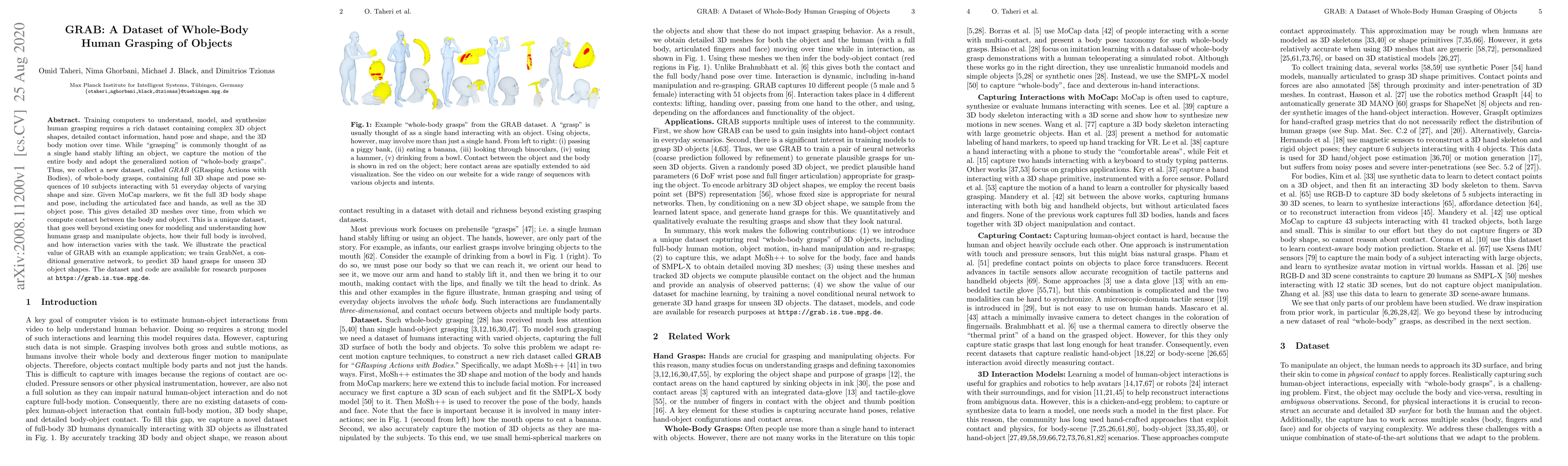 The GRAB dataset captures detailed 3D sequences of whole-body human grasping actions, including full body and object interactions, to advance computer modeling of human grasping. An example application trains GrabNet to predict 3D hand grasps for unseen objects, demonstrating the dataset's utility.
