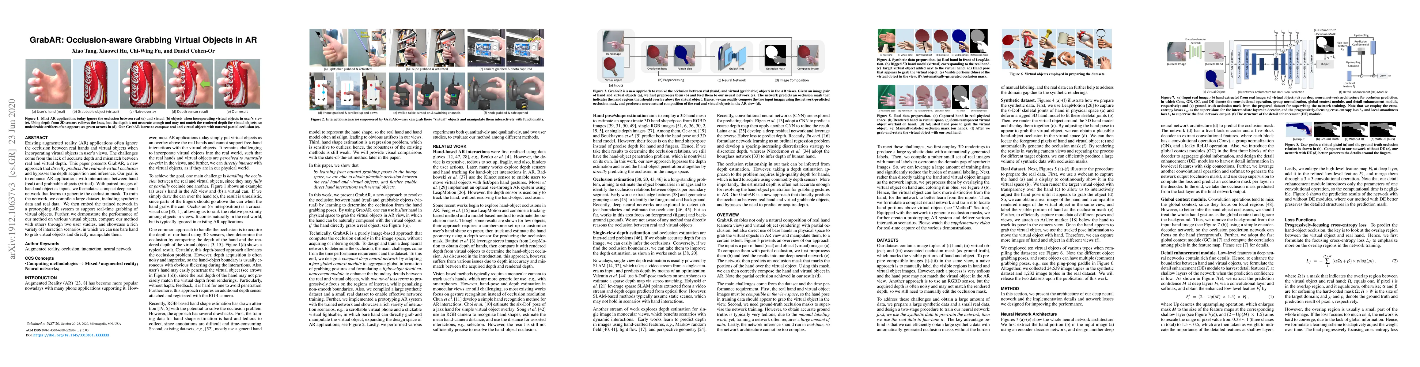 GrabAR introduces a novel approach to predict real-and-virtual occlusion in AR, eliminating the need for depth acquisition and inference. The method uses a neural network trained on synthetic and real datasets to generate occlusion masks, enabling intuitive hand-object interactions in AR applications.