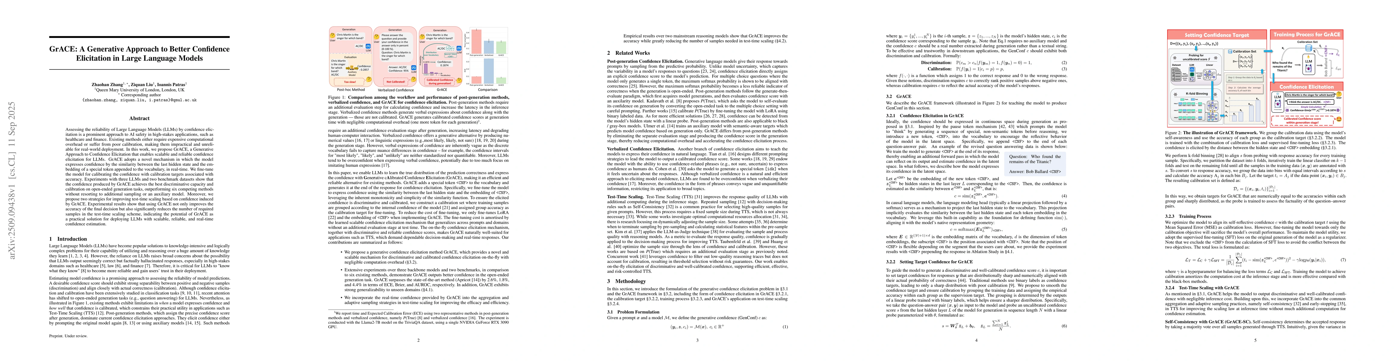 Assessing the reliability of Large Language Models (LLMs) by confidence elicitation is a prominent approach to AI safety in high-stakes applications, such as healthcare and finance. Existing methods either require expensive computational overhead or suffer from poor calibration, making them impractical and unreliable for real-world deployment. In this work, we propose GrACE, a Generative Approach to Confidence Elicitation that enables scalable and reliable confidence elicitation for LLMs. GrACE adopts a novel mechanism in which the model expresses confidence by the similarity between the last hidden state and the embedding of a special token appended to the vocabulary, in real-time. We fine-tune the model for calibrating the confidence with calibration targets associated with accuracy. Experiments with three LLMs and two benchmark datasets show that the confidence produced by GrACE achieves the best discriminative capacity and calibration on open-ended generation tasks, outperforming six competing methods without resorting to additional sampling or an auxiliary model. Moreover, we propose two strategies for improving test-time scaling based on confidence induced by GrACE. Experimental results show that using GrACE not only improves the accuracy of the final decision but also significantly reduces the number of required samples in the test-time scaling scheme, indicating the potential of GrACE as a practical solution for deploying LLMs with scalable, reliable, and real-time confidence estimation.