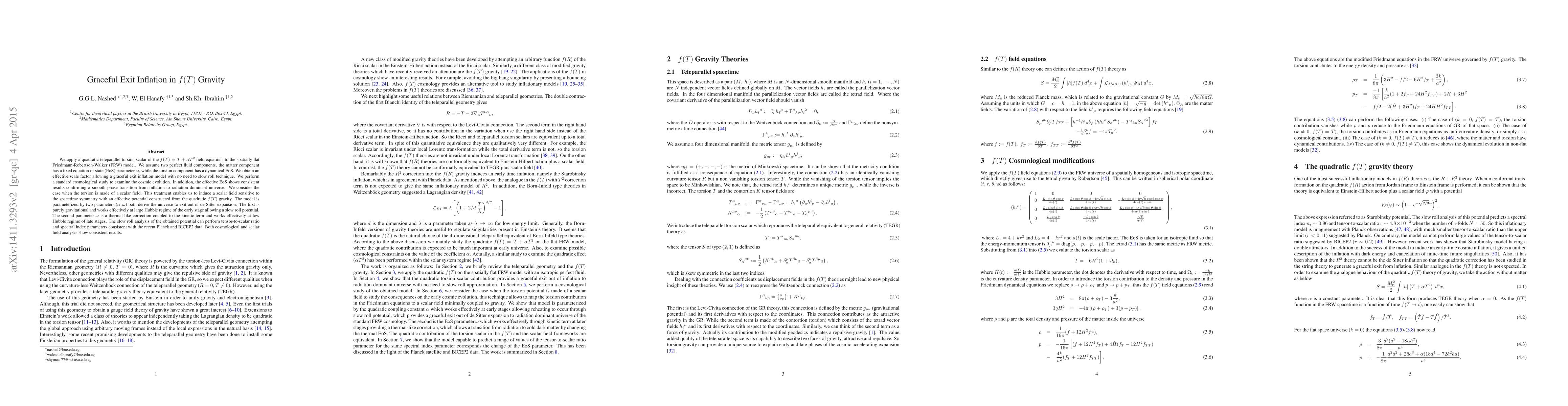 We apply a quadratic teleparallel torsion scalar of the $f(T)=T+\alpha T^{2}$ field equations to the spatially flat Friedmann-Robertson-Walker (FRW) model. We assume two perfect fluid components, the matter component has a fixed equation of state (EoS) parameter $\omega$, while the torsion component has a dynamical EoS. We obtain an effective scale factor allowing a graceful exit inflation model with no need to slow roll technique. We perform a standard cosmological study to examine the cosmic evolution. In addition, the effective EoS shows consistent results confirming a smooth phase transition from inflation to radiation dominant universe. We consider the case when the torsion is made of a scalar field. This treatment enables us to induce a scalar field sensitive to the spacetime symmetry with an effective potential constructed from the quadratic $f(T)$ gravity. The model is parameterized by two parameters ($\alpha,\omega$) both derive the universe to exit out of de Sitter expansion. The first is purely gravitational and works effectively at large Hubble regime of the early stage allowing a slow roll potential. The second parameter $\omega$ is a thermal-like correction coupled to the kinetic term and works effectively at low Hubble regime of late stages. The slow roll analysis of the obtained potential can perform tensor-to-scalar ratio and spectral index parameters consistent with the recent Planck and BICEP2 data. Both cosmological and scalar field analyses show consistent results.