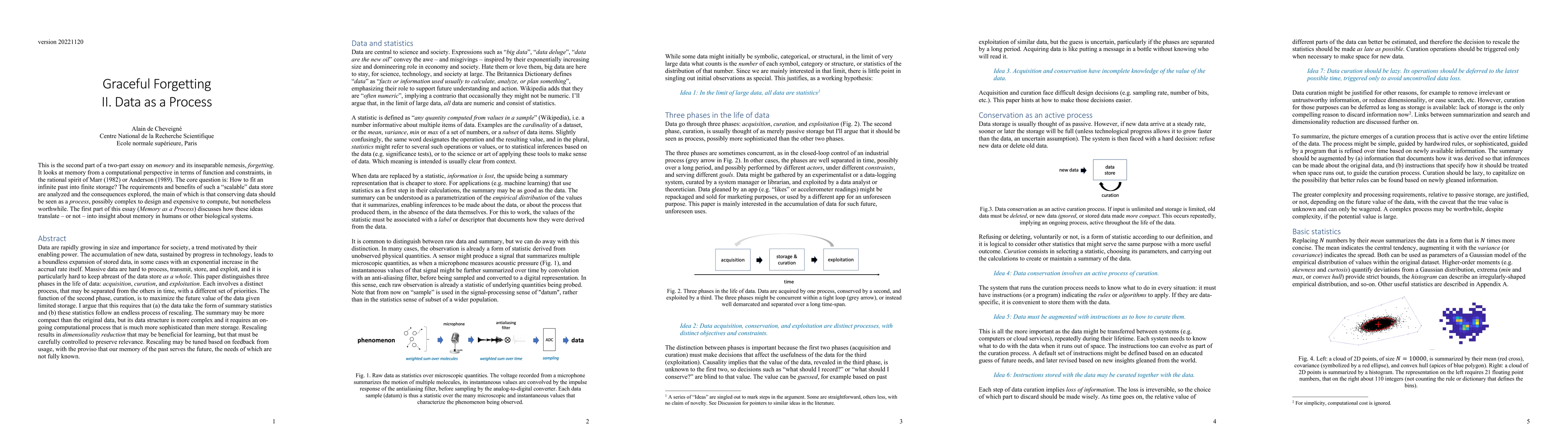 Data are rapidly growing in size and importance for society, a trend motivated by their enabling power. The accumulation of new data, sustained by progress in technology, leads to a boundless expansion of stored data, in some cases with an exponential increase in the accrual rate itself. Massive data are hard to process, transmit, store, and exploit, and it is particularly hard to keep abreast of the data store as a whole. This paper distinguishes three phases in the life of data: acquisition, curation, and exploitation. Each involves a distinct process, that may be separated from the others in time, with a different set of priorities. The function of the second phase, curation, is to maximize the future value of the data given limited storage. I argue that this requires that (a) the data take the form of summary statistics and (b) these statistics follow an endless process of rescaling. The summary may be more compact than the original data, but its data structure is more complex and it requires an on-going computational process that is much more sophisticated than mere storage. Rescaling results in dimensionality reduction that may be beneficial for learning, but that must be carefully controlled to preserve relevance. Rescaling may be tuned based on feedback from usage, with the proviso that our memory of the past serves the future, the needs of which are not fully known.
