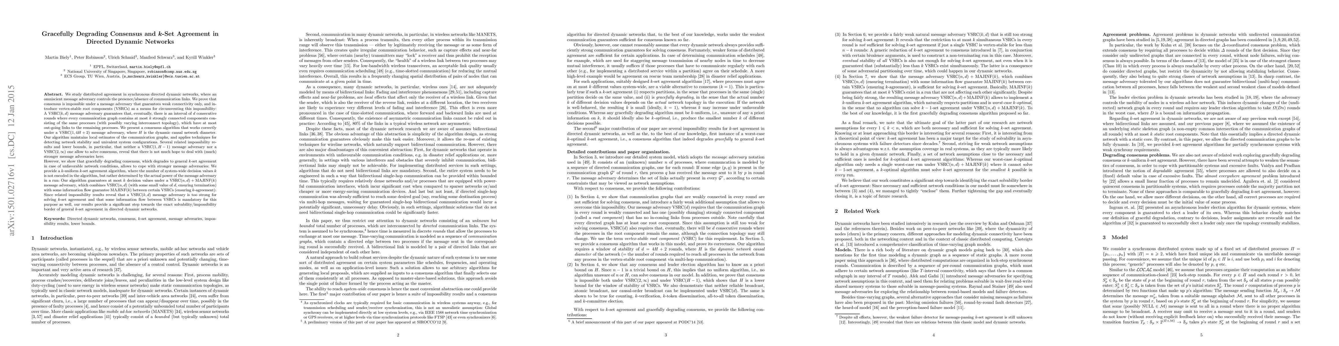 This paper explores consensus and $k$-set agreement in directed dynamic networks under adversarial link availability. It proves consensus is impossible under weak connectivity guarantees but introduces vertex-stable root components (VSRCs) to achieve consensus under certain conditions. It also presents a gracefully degrading consensus algorithm that transitions to $k$-set agreement under stronger adversaries, marking a significant step towards understanding the solvability of $k$-set agreement in such networks.