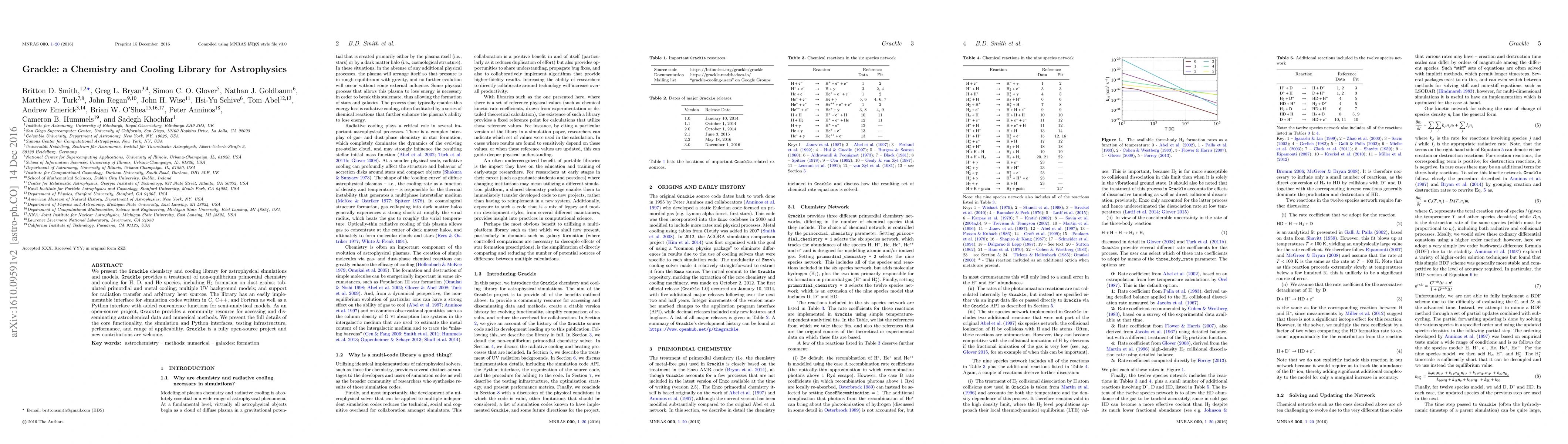 Grackle is an open-source library for astrophysical simulations that offers non-equilibrium chemistry and cooling models for H, D, and He species, including H2 formation on dust grains and multiple UV background models. It supports C, C++, Fortran, and Python interfaces, making it a versatile resource for the astrophysics community.