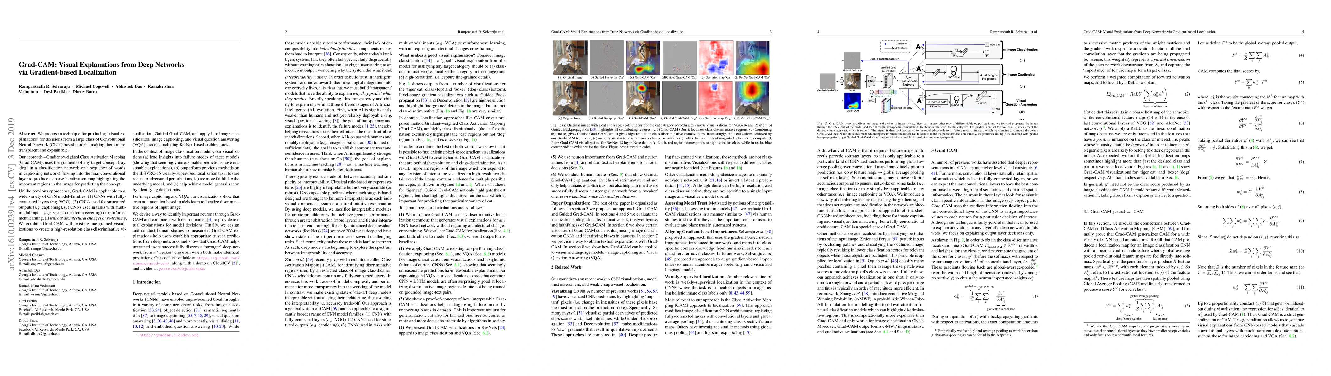 We propose a technique for producing "visual explanations" for decisions from a large class of CNN-based models, making them more transparent. Our approach - Gradient-weighted Class Activation Mapping (Grad-CAM), uses the gradients of any target concept, flowing into the final convolutional layer to produce a coarse localization map highlighting important regions in the image for predicting the concept. Grad-CAM is applicable to a wide variety of CNN model-families: (1) CNNs with fully-connected layers, (2) CNNs used for structured outputs, (3) CNNs used in tasks with multimodal inputs or reinforcement learning, without any architectural changes or re-training. We combine Grad-CAM with fine-grained visualizations to create a high-resolution class-discriminative visualization and apply it to off-the-shelf image classification, captioning, and visual question answering (VQA) models, including ResNet-based architectures. In the context of image classification models, our visualizations (a) lend insights into their failure modes, (b) are robust to adversarial images, (c) outperform previous methods on localization, (d) are more faithful to the underlying model and (e) help achieve generalization by identifying dataset bias. For captioning and VQA, we show that even non-attention based models can localize inputs. We devise a way to identify important neurons through Grad-CAM and combine it with neuron names to provide textual explanations for model decisions. Finally, we design and conduct human studies to measure if Grad-CAM helps users establish appropriate trust in predictions from models and show that Grad-CAM helps untrained users successfully discern a 'stronger' nodel from a 'weaker' one even when both make identical predictions. Our code is available at https://github.com/ramprs/grad-cam/, along with a demo at http://gradcam.cloudcv.org, and a video at youtu.be/COjUB9Izk6E.