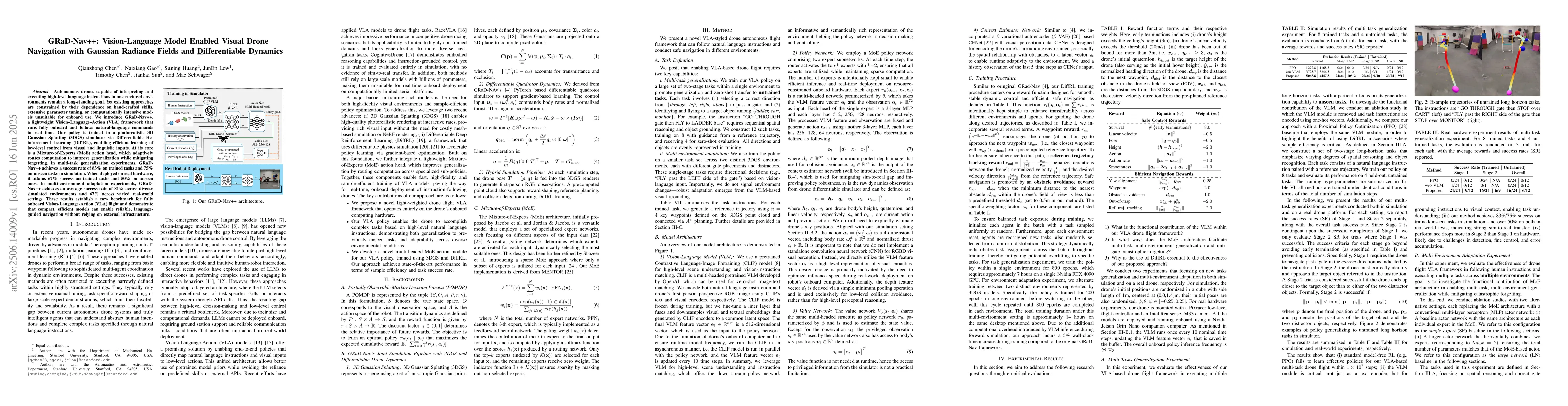 Autonomous drones capable of interpreting and executing high-level language instructions in unstructured environments remain a long-standing goal. Yet existing approaches are constrained by their dependence on hand-crafted skills, extensive parameter tuning, or computationally intensive models unsuitable for onboard use. We introduce GRaD-Nav++, a lightweight Vision-Language-Action (VLA) framework that runs fully onboard and follows natural-language commands in real time. Our policy is trained in a photorealistic 3D Gaussian Splatting (3DGS) simulator via Differentiable Reinforcement Learning (DiffRL), enabling efficient learning of low-level control from visual and linguistic inputs. At its core is a Mixture-of-Experts (MoE) action head, which adaptively routes computation to improve generalization while mitigating forgetting. In multi-task generalization experiments, GRaD-Nav++ achieves a success rate of 83% on trained tasks and 75% on unseen tasks in simulation. When deployed on real hardware, it attains 67% success on trained tasks and 50% on unseen ones. In multi-environment adaptation experiments, GRaD-Nav++ achieves an average success rate of 81% across diverse simulated environments and 67% across varied real-world settings. These results establish a new benchmark for fully onboard Vision-Language-Action (VLA) flight and demonstrate that compact, efficient models can enable reliable, language-guided navigation without relying on external infrastructure.