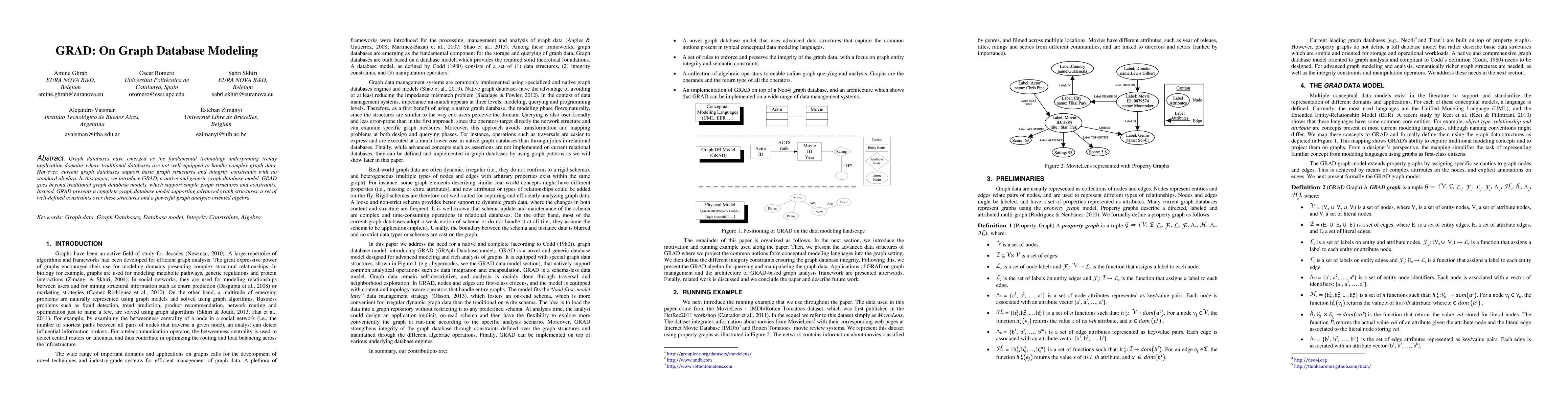Summary: This paper introduces GRAD, a comprehensive graph database model that extends beyond basic graph structures and constraints, offering advanced graph structures, well-defined constraints, and a powerful graph analysis-oriented algebra. GRAD aims to address the limitations of current graph databases in handling complex graph data.