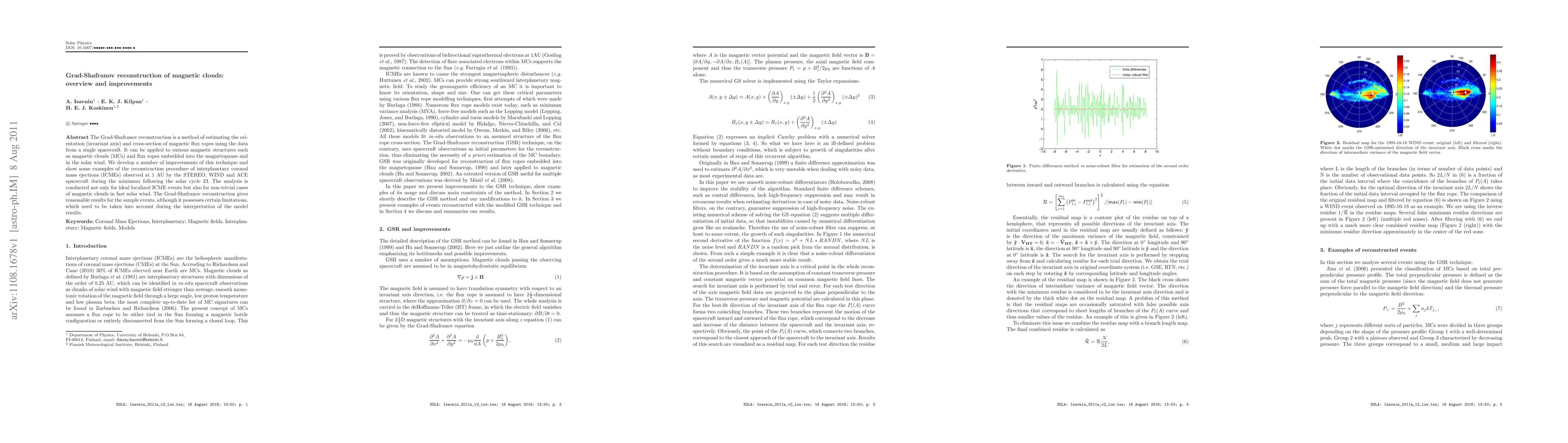 The Grad-Shafranov reconstruction is a method of estimating the orientation (invariant axis) and cross-section of magnetic flux ropes using the data from a single spacecraft. It can be applied to various magnetic structures such as magnetic clouds (MCs) and flux ropes embedded into the magnetopause and in the solar wind. We develop a number of improvements of this technique and show some examples of the reconstruction procedure of interplanetary coronal mass ejections (ICMEs) observed at 1 AU by the STEREO, WIND and ACE spacecraft during the minimum following the solar cycle 23. The analysis is conducted not only for ideal localized ICME events but also for non-trivial cases of magnetic clouds in fast solar wind. The Grad-Shafranov reconstruction gives reasonable results for the sample events, although it possesses certain limitations, which need to be taken into account during the interpretation of the model results.