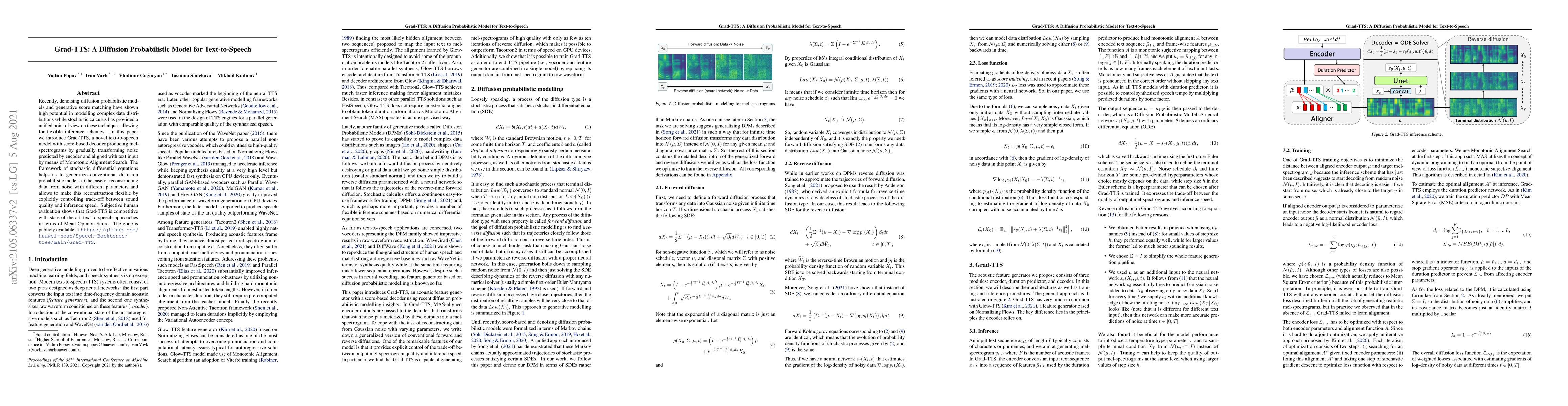 Grad-TTS employs a diffusion probabilistic model to generate high-quality mel-spectrograms for text-to-speech, leveraging score-based decoding and Monotonic Alignment Search. The model's flexibility in balancing sound quality and inference speed is achieved through stochastic differential equations, outperforming state-of-the-art methods in human evaluation.