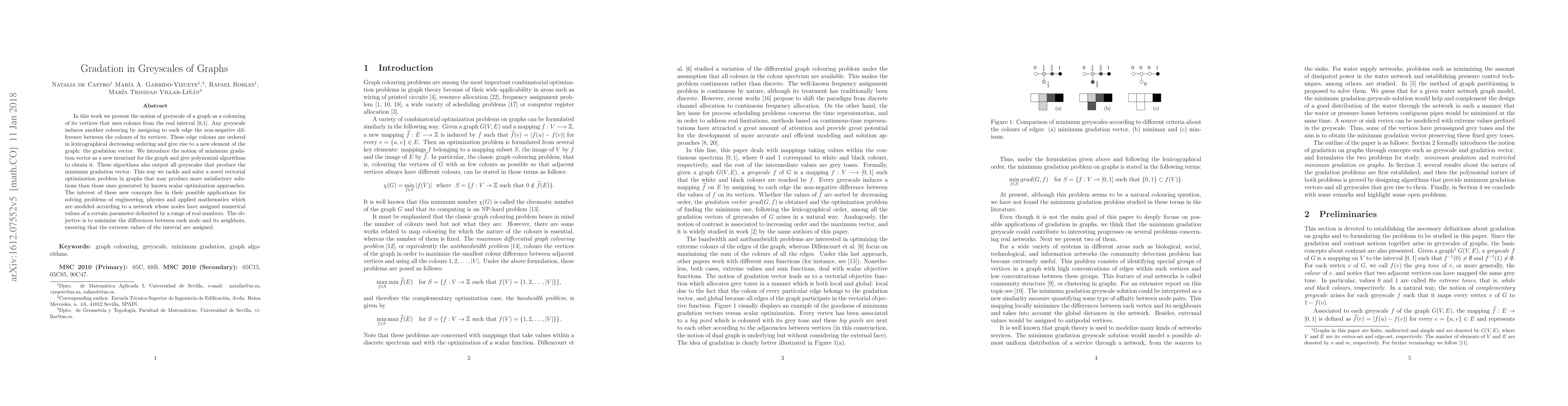 In this work we present the notion of greyscale of a graph as a colouring of its vertices that uses colours from the real interval [0,1]. Any greyscale induces another colouring by assigning to each edge the non-negative difference between the colours of its vertices. These edge colours are ordered in lexicographical decreasing ordering and gives rise to a new element of the graph: the gradation vector. We introduce the notion of minimum gradation vector as a new invariant for the graph and give polynomial algorithms to obtain it. These algorithms also output all greyscales that produce the minimum gradation vector. This way we tackle and solve a novel vectorial optimization problem in graphs that may produce more satisfactory solutions than those ones generated by known scalar optimization approaches. The interest of these new concepts lies in their possible applications for solving problems of engineering, physics and applied mathematics which are modeled according to a network whose nodes have assigned numerical values of a certain parameter delimited by a range of real numbers. The objective is to minimize the differences between each node and its neighbors, ensuring that the extreme values of the interval are assigned.