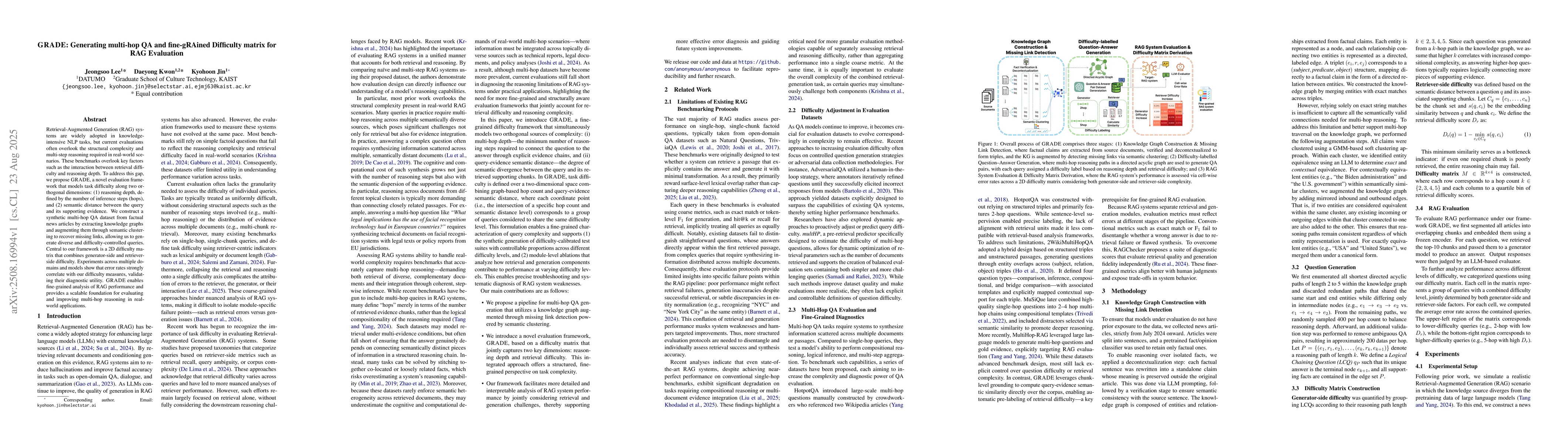 Retrieval-Augmented Generation (RAG) systems are widely adopted in knowledge-intensive NLP tasks, but current evaluations often overlook the structural complexity and multi-step reasoning required in real-world scenarios. These benchmarks overlook key factors such as the interaction between retrieval difficulty and reasoning depth. To address this gap, we propose \textsc{GRADE}, a novel evaluation framework that models task difficulty along two orthogonal dimensions: (1) reasoning depth, defined by the number of inference steps (hops), and (2) semantic distance between the query and its supporting evidence. We construct a synthetic multi-hop QA dataset from factual news articles by extracting knowledge graphs and augmenting them through semantic clustering to recover missing links, allowing us to generate diverse and difficulty-controlled queries. Central to our framework is a 2D difficulty matrix that combines generator-side and retriever-side difficulty. Experiments across multiple domains and models show that error rates strongly correlate with our difficulty measures, validating their diagnostic utility. \textsc{GRADE} enables fine-grained analysis of RAG performance and provides a scalable foundation for evaluating and improving multi-hop reasoning in real-world applications.