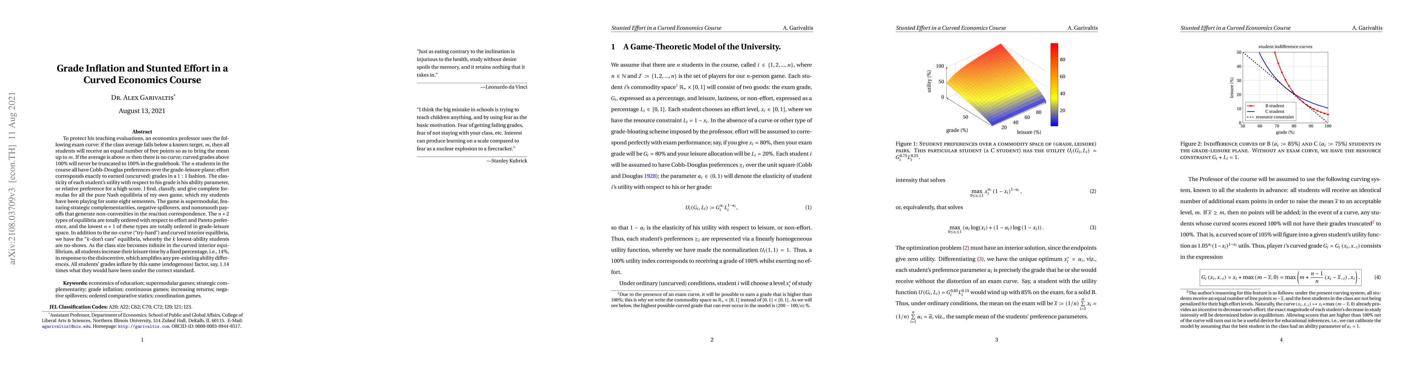 A study found that grade inflation in a curved economics course leads to students stunting their effort, resulting in lower grades for able students. As the class size increases, this effect amplifies, leading to a 14% increase in leisure time and a 14% increase in inflated grades.