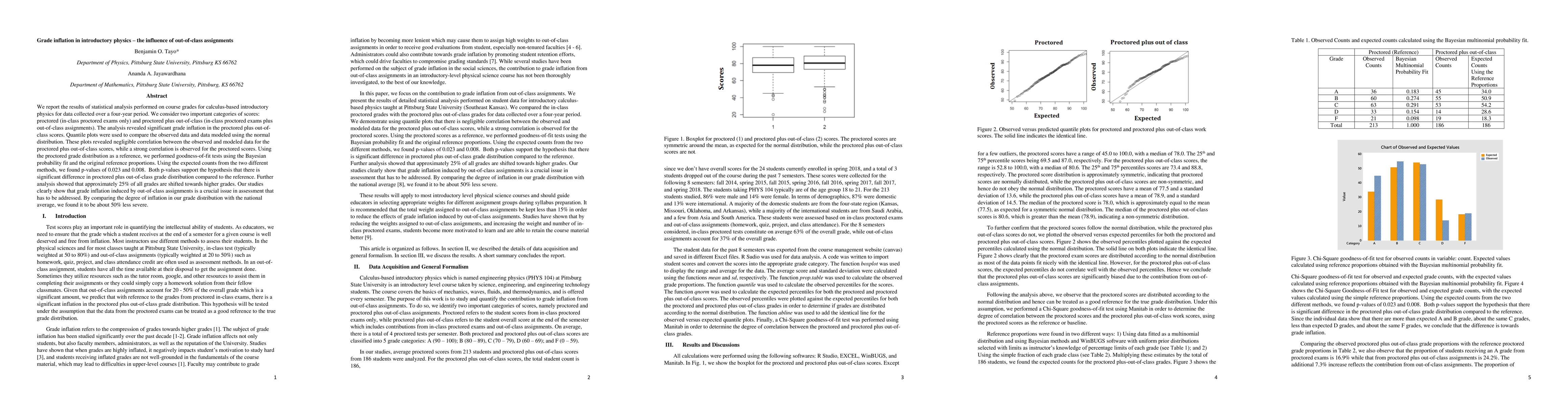 We report the results of statistical analysis performed on course grades for calculus-based introductory physics for data collected over a four-year period. We consider two important categories of scores: proctored (in-class proctored exams only) and proctored plus out-of-class (in-class proctored exams plus out-of-class assignments). The analysis revealed significant grade inflation in the proctored plus out-of-class scores. Quantile plots were used to compare the observed data and data modeled using the normal distribution. These plots revealed negligible correlation between the observed and modeled data for the proctored plus out-of-class scores, while a strong correlation is observed for the proctored scores. Using the proctored grade distribution as a reference, we performed goodness-of-fit tests using the Bayesian probability fit and the original reference proportions. Using the expected counts from the two different methods, we found p-values of 0.023 and 0.008. Both p-values support the hypothesis that there is significant difference in proctored plus out-of-class grade distribution compared to the reference. Further analysis showed that approximately 25% of all grades are shifted towards higher grades. Our studies clearly show that grade inflation induced by out-of-class assignments is a crucial issue in assessment that has to be addressed. By comparing the degree of inflation in our grade distribution with the national average, we found it to be about 50% less severe.