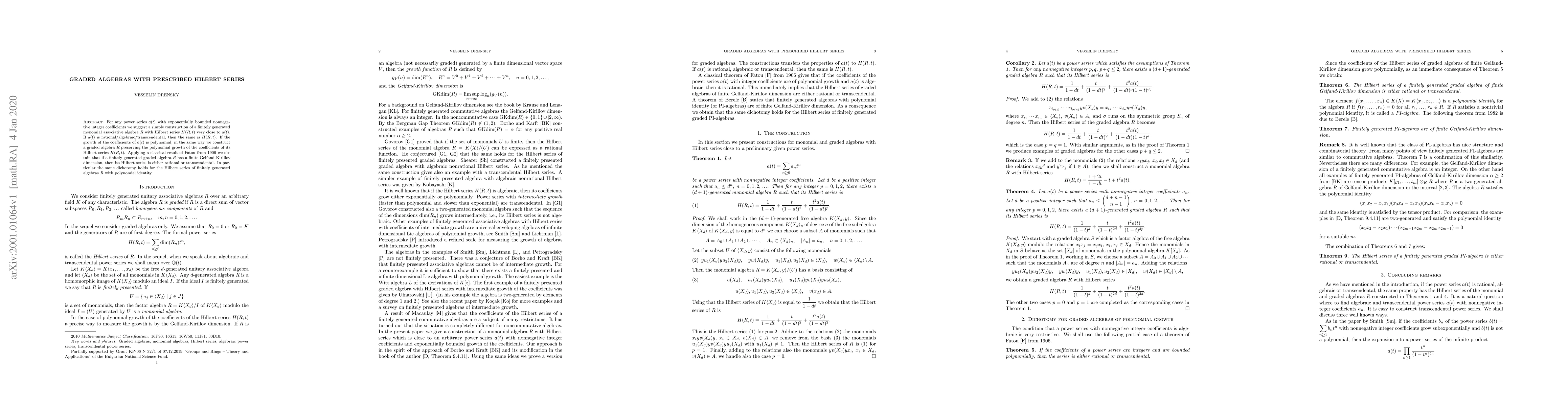 For any power series $a(t)$ with exponentially bounded nonnegative integer coefficients we suggest a simple construction of a finitely generated monomial associative algebra $R$ with Hilbert series $H(R,t)$ very close to $a(t)$. If $a(t)$ is rational/algebraic/transcendental, then the same is $H(R,t)$. If the growth of the coefficients of $a(t)$ is polynomial, in the same way we construct a graded algebra $R$ preserving the polynomial growth of the coefficients of its Hilbert series $H(R,t)$. Applying a classical result of Fatou from 1906 we obtain that if a finitely generated graded algebra $R$ has a finite Gelfand-Kirillov dimension, then its Hilbert series is either rational or transcendental. In particular the same dichotomy holds for the Hilbert series of finitely generated algebras $R$ with polynomial identity.