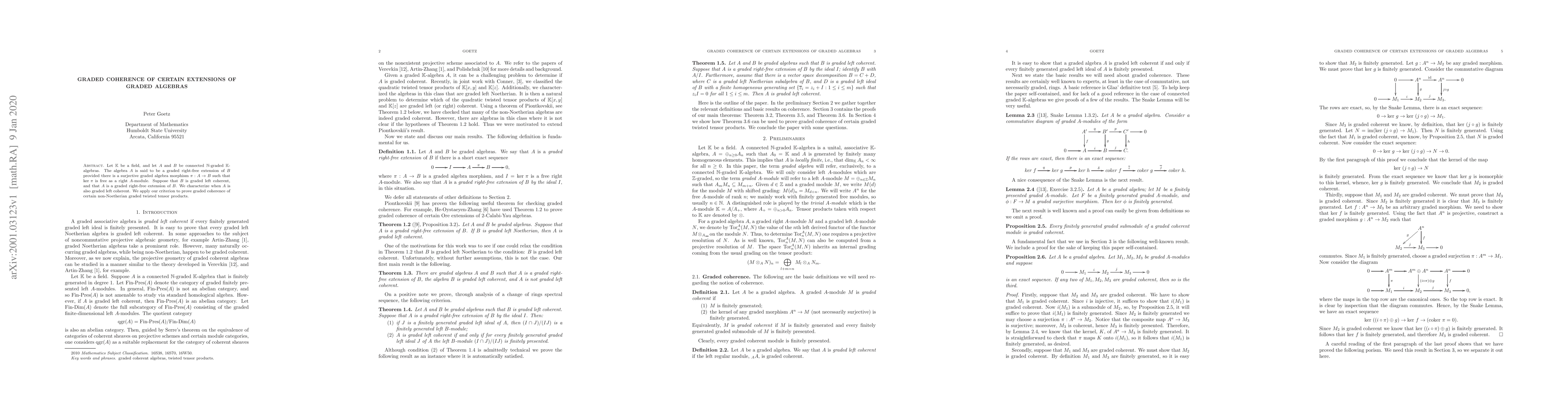 This paper explores the graded coherence of extensions of $\N$-graded algebras, specifically when $A$ is a graded right-free extension of $B$. It provides a criterion for $A$ to be graded left coherent if $B$ is graded left coherent, and applies this to demonstrate graded coherence in certain non-Noetherian graded twisted tensor products.