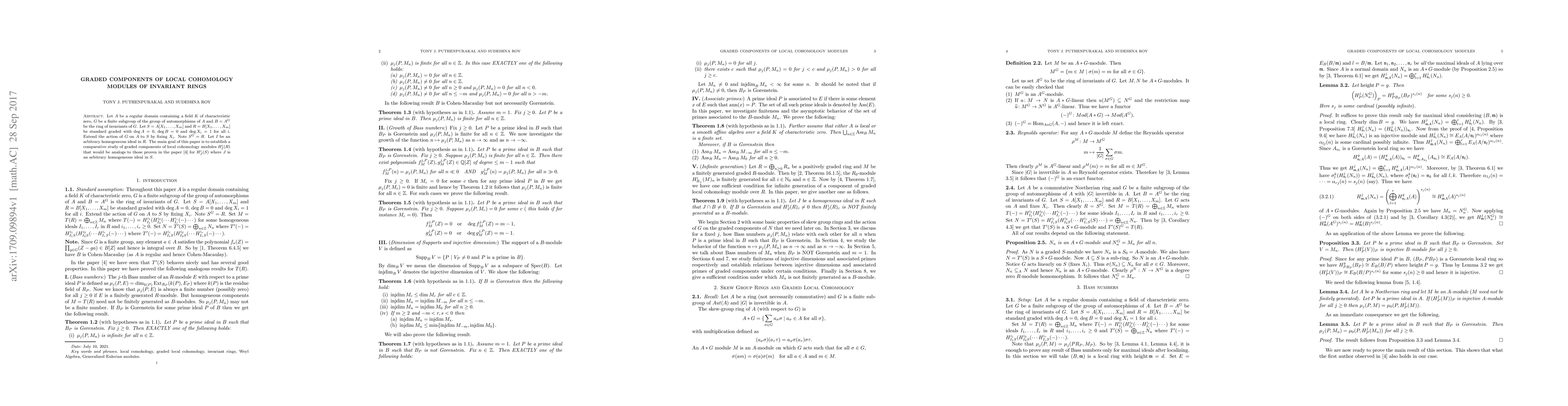 Let $A$ be a regular domain containing a field $K$ of characteristic zero, $G$ be a finite subgroup of the group of automorphisms of $A$ and $B=A^G$ be the ring of invariants of $G$. Let $S= A[X_1,\ldots, X_m]$ and $R= B[X_1, \ldots, X_m]$ be standard graded with $\ deg \ A=0$, $\ deg \ B=0$ and $\ deg \ X_i=1$ for all $i$. Extend the action of $G$ on $A$ to $S$ by fixing $X_i$. Note $S^G=R$. Let $I$ be an arbitrary homogeneous ideal in $R$. The main goal of this paper is to establish a comparative study of graded components of local cohomology modules $H_I^i(R)$ that would be analogs to those proven in a previous paper of the first author for $H_J^i(S)$ where $J$ is an arbitrary homogeneous ideal in $S$.