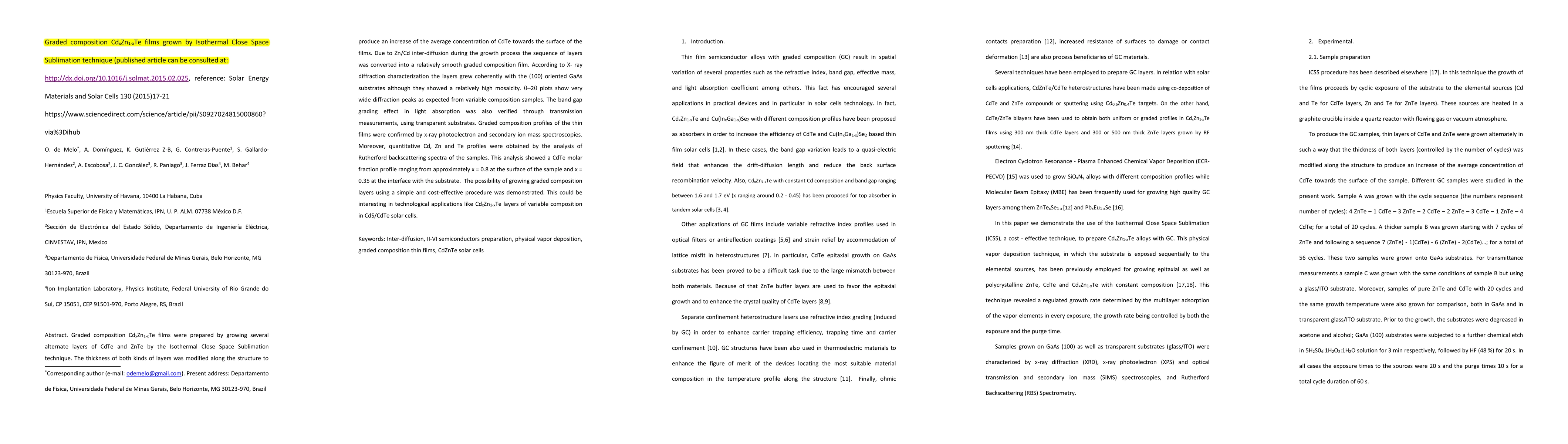Graded composition CdxZn1-xTe films were prepared by growing several alternate layers of CdTe and ZnTe by the Isothermal Close Space Sublimation technique. The thickness of both kinds of layers was modified along the structure to produce an increase of the average concentration of CdTe towards the surface of the films. Due to Zn/Cd inter-diffusion during the growth process the sequence of layers was converted into a relatively smooth graded composition film. According to X- ray diffraction characterization the layers grew coherently with the (100) oriented GaAs substrates although they showed a relatively high mosaicity. Theta-2theta plots show very wide diffraction peaks as expected from variable composition samples. The band gap grading effect in light absorption was also verified through transmission measurements, using transparent substrates. Graded composition profiles of the thin films were confirmed by x-ray photoelectron and secondary ion mass spectroscopies. Moreover, quantitative Cd, Zn and Te profiles were obtained by the analysis of Rutherford backscattering spectra of the samples. This analysis showed a CdTe molar fraction profile ranging from approximately x = 0.8 at the surface of the sample and x = 0.35 at the interface with the substrate. The possibility of growing graded composition layers using a simple and cost-effective procedure was demonstrated. This could be interesting in technological applications like CdxZn1-xTe layers of variable composition in CdS/CdTe solar cells