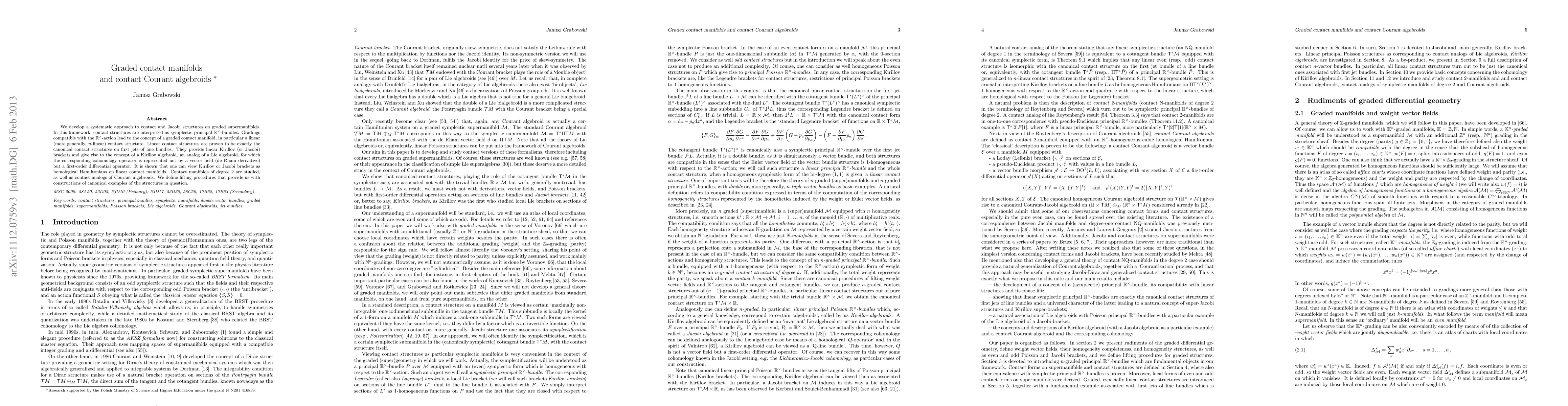 We develop a systematic approach to contact and Jacobi structures on graded supermanifolds. In this framework, contact structures are interpreted as symplectic principal GL(1,R)-bundles. Gradings compatible with the GL(1,R)-action lead to the concept of a graded contact manifold, in particular a linear (more generally, n-linear) contact structure. Linear contact structures are proven to be exactly the canonical contact structures on first jets of line bundles. They provide linear Kirillov (or Jacobi) brackets and give rise to the concept of a Kirillov algebroid, an analog of a Lie algebroid, for which the corresponding cohomology operator is represented not by a vector field (de Rham derivative) but a first-order differential operator. It is shown that one can view Kirillov or Jacobi brackets as homological Hamiltonians on linear contact manifolds. Contact manifolds of degree 2 are studied, as well as contact analogs of Courant algebroids. We define lifting procedures that provide us with constructions of canonical examples of the structures in question.