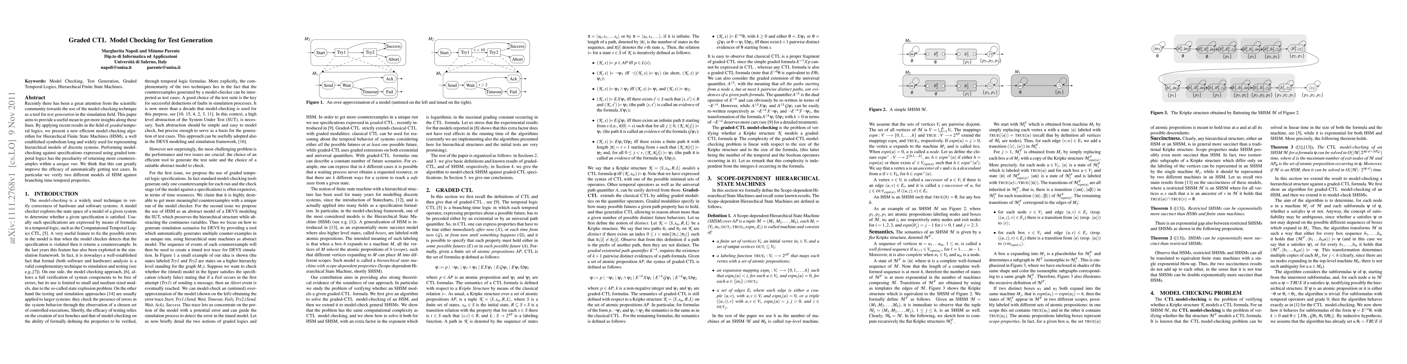 This paper introduces an efficient model-checking algorithm for Hierarchical Finite State Machines (HSM) using graded temporal logics, aiming to enhance test generation. The method returns multiple counterexamples in a single run, potentially improving the efficacy of automatic test case generation.