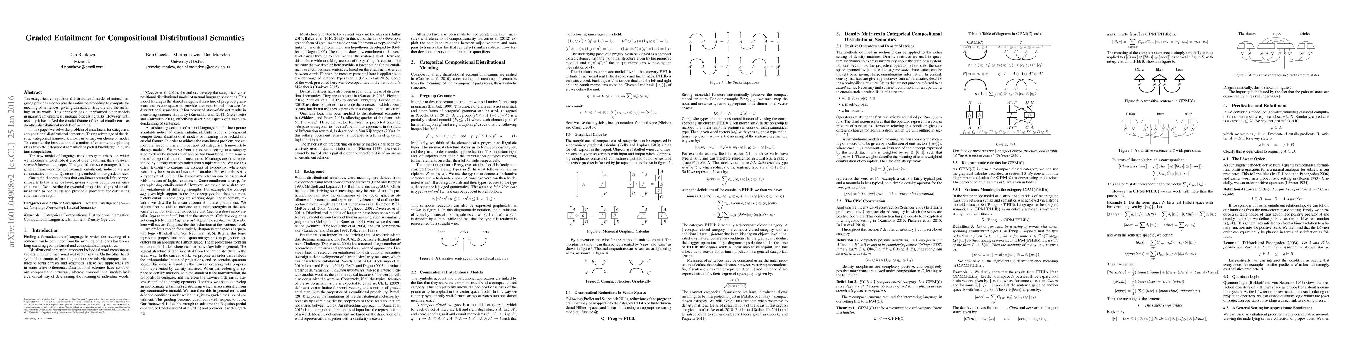 The categorical compositional distributional model of natural language provides a conceptually motivated procedure to compute the meaning of sentences, given grammatical structure and the meanings of its words. This approach has outperformed other models in mainstream empirical language processing tasks. However, until recently it has lacked the crucial feature of lexical entailment -- as do other distributional models of meaning. In this paper we solve the problem of entailment for categorical compositional distributional semantics. Taking advantage of the abstract categorical framework allows us to vary our choice of model. This enables the introduction of a notion of entailment, exploiting ideas from the categorical semantics of partial knowledge in quantum computation. The new model of language uses density matrices, on which we introduce a novel robust graded order capturing the entailment strength between concepts. This graded measure emerges from a general framework for approximate entailment, induced by any commutative monoid. Quantum logic embeds in our graded order. Our main theorem shows that entailment strength lifts compositionally to the sentence level, giving a lower bound on sentence entailment. We describe the essential properties of graded entailment such as continuity, and provide a procedure for calculating entailment strength.