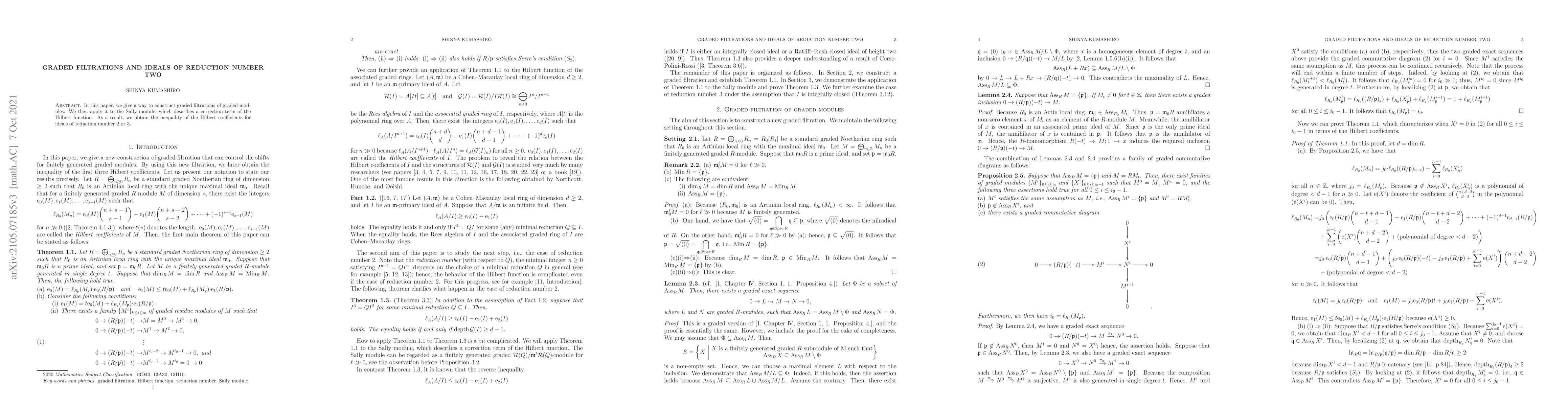 In this paper, we give a way to construct graded filtrations of graded modules. We then apply it to the Sally module, which describes a correction term of the Hilbert function. As a result, we obtain the inequality of the Hilbert coefficients for ideals of reduction number $2$ or $3$.