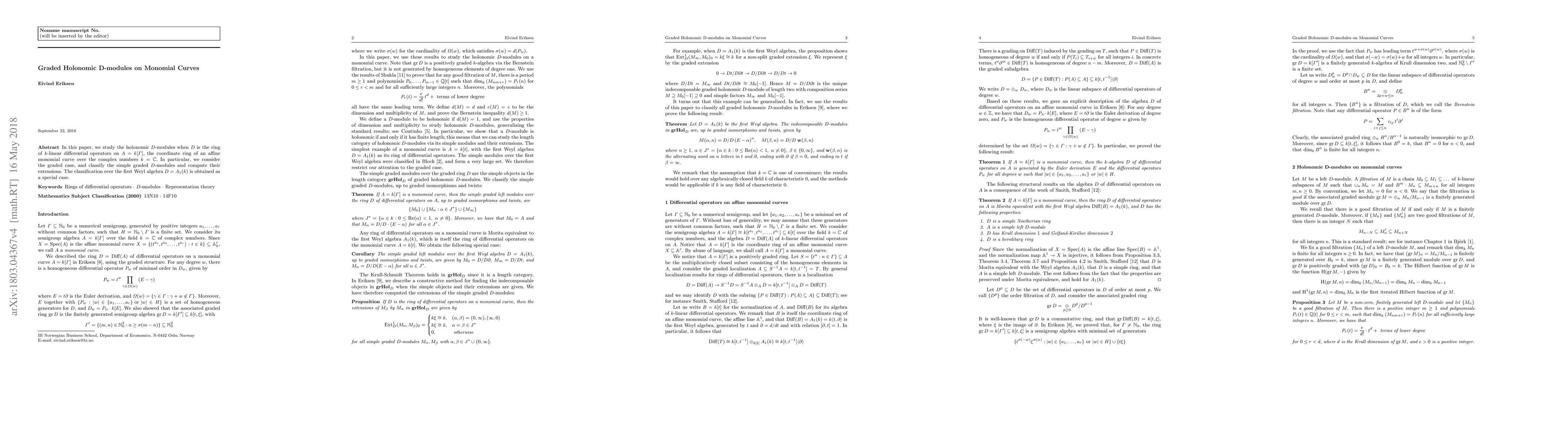 This paper classifies simple graded holonomic $D$-modules for the ring of $k$-linear differential operators on the coordinate ring of an affine monomial curve over $\mathbb{C}$, and computes their extensions, with a special focus on the first Weyl algebra.