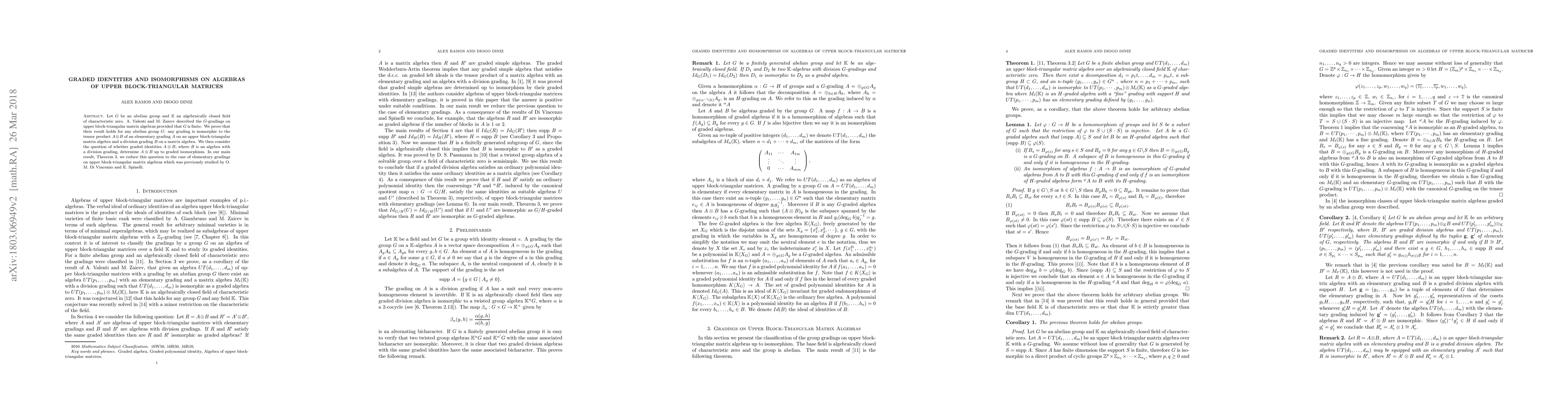 Let $G$ be an abelian group and $\mathbb{K}$ an algebraically closed field of characteristic zero. A. Valenti and M. Zaicev described the $G$-gradings on upper block-triangular matrix algebras provided that $G$ is finite. We prove that their result holds for any abelian group $G$: any grading is isomorphic to the tensor product $A\otimes B$ of an elementary grading $A$ on an upper block-triangular matrix algebra and a division grading $B$ on a matrix algebra. We then consider the question of whether graded identities $A\otimes B$, where $B$ is an algebra with a division grading, determine $A\otimes B$ up to graded isomorphism. In our main result, Theorem 3, we reduce this question to the case of elementary gradings on upper block-triangular matrix algebras which was previously studied by O. M. Di Vincenzo and E. Spinelli.